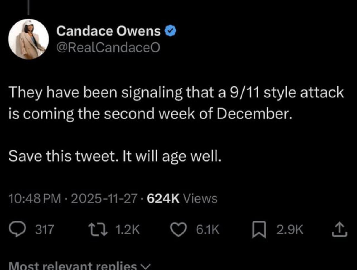 >>41600765qatar was attacked. this was covered up by the killing of kirk. I would assume if candace saw signs from 'they' shed leak them. thats a little rude to leave it all a surprise. i mean, deniable if nothing happens. (i scared em off) unhelpful if something does (told ya so) but bish. WHAT fucking signs. everything is a fucking sign RN
