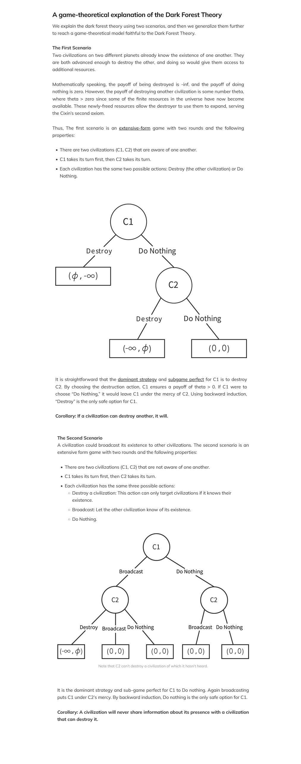 >>41601004This application of game theory is astronomically retarded.First off, in real life, if you CAN destroy one another, that doesn't imply you WILL or WANT to.Secondly, assuming each player in the game either goes first or second denies the reality that even kings and leaders here on earth have consistently typically known of incursions long before they happened.That's why armies would march to meet each other.You think C2 wouldn't immediately know of C1's plans or have already used AI or other tools to have already gamed all possible outcomes - and thus already prepared defense plans?Their use of "corollary" is abhorrent as none of this is actually proven to be the "only" strategies.The more resources and tech you have, the larger range of options you have on the playing board.Then in game scenario 2, not all forms of broadcast are the same. It could be physical, EMF. It could be a good-natured broadcast, or it could be a trap like an angler lurking in the dark.Neither of these scenarios account for the concept of stealth-maxing where species would poke and prod silent and stealthily, like dipping their toes in the water, to analyze and gauge who they're interacting with.Whoever wrote this game theory mock-up is a faggot who should be publicly shunned for their discredit to gaming across the universe.I'd even go so far as to say they deserve 20 lashes with a whip.They could've chosen to masturbate and they would've contributed more to our species than by concocting this trite inane faggotry.My day is infinitely worse for having seen this bullshit.