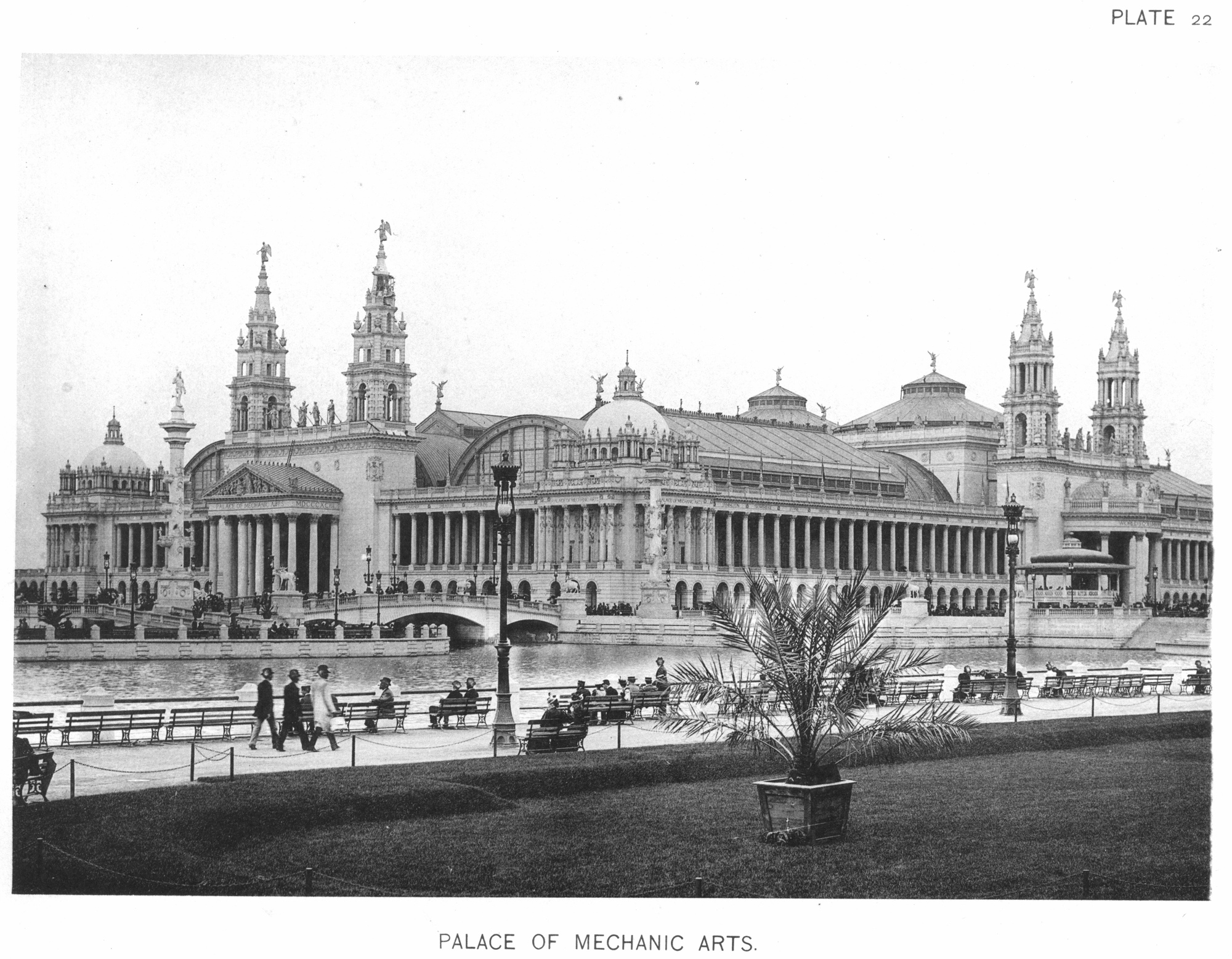 The site of the exposition itself gained the nickname the “White City” due to the appearance of its massive white buildings. The White City showcased chief architect Daniel Burnham’s ideas for a “City Beautiful” movement. While the fair’s buildings were not designed to be permanent structures, their architects used the grandeur and romance of Beaux-Arts classicism to legitimize the architecture of the pavilions and evoke solidity in this young city. Burnham and Edward H. Bennett’s 1909 Plan of Chicago was a culmination of lessons learned at the fair. The plan offered Chicago a blueprint for growth and influenced city planning around the world.