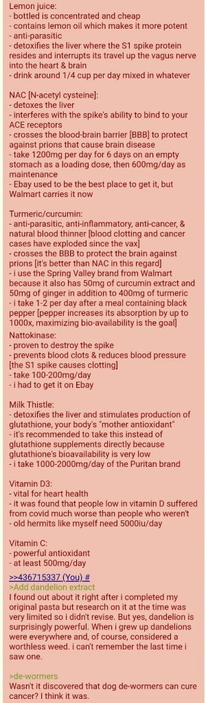 >>41642445Anyone got the QRD on the protocol for cleansing spike proteins? I have plenty of NAC. I'm unvaxxed but my wife had to get it for her job :(Only one shot though, no boosters so I'm hopeful.