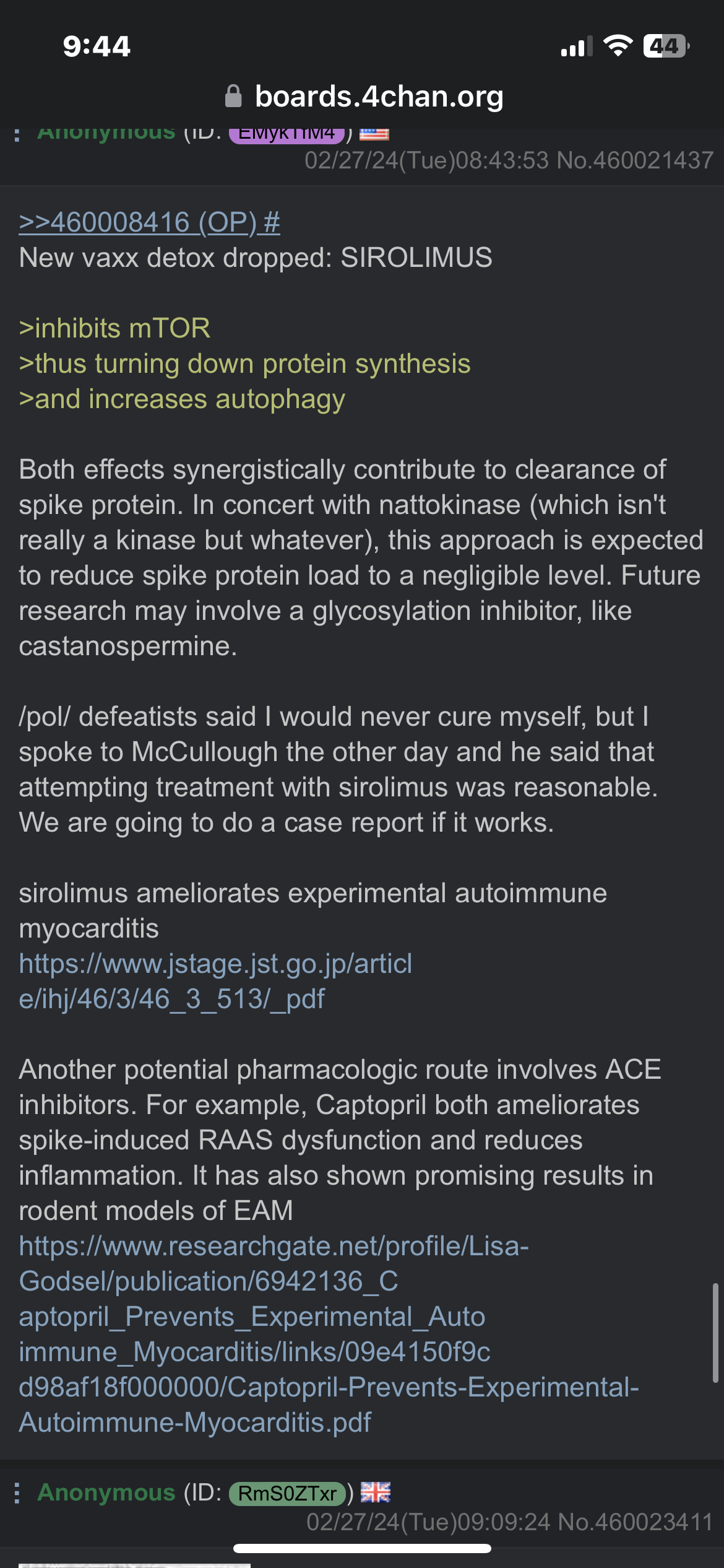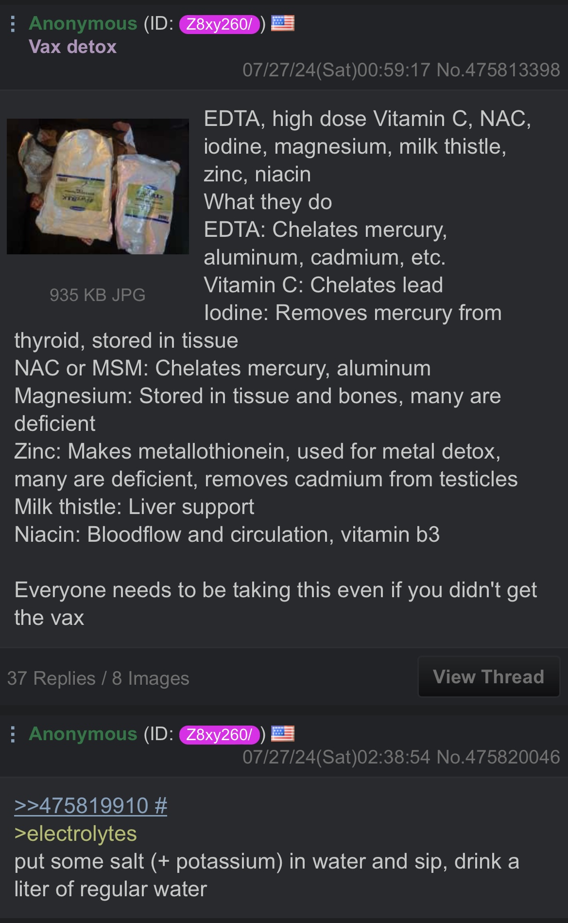 >>41648842>START HERE! If you want to read only 1 thing, let it be this PDF>Cosmic Death Fungus: A Primer On An Ancient Enemyhttps://www.docdroid.net/FX4DpXm/cdf-nac-protocol-pdf>Join /cdf/ General here for regular info drops and the latest research. This is also moderated:https://www.godlikeproductions.com/forum1/message5240986/pg1DO NOT USE SWANSON, PURITANS PRIDE OR NATURES TRUTH OREGANO OIL FOR THE NAC/CDF PROTOCOL. YOU NEED 40MG CARVACROL MINIMUM FOR EACH MORNING/NIGHT DOSE. IF IT DOESNT STATE CARVACROL CONTENT, DONT USE IT. >The Parasite Pillhttps://files.catbox.moe/q4agf7.pdf>basic gestalt on anti-parasitic treatments both herbal and synthetichttps://files.catbox.moe/ue69ab.pdf>Additional informational PDFhttps://static1.squarespace.com/static/5ca959c23560c369880b1806/t/5d4f86f20213620001e7a7ac/1565492985774/Parasites.pdf>The Hidden Epidemic In North American Parasiteshttps://archive.is/oO9aO#selection-819.0-830.0...Space Cowboy !!f9JH9UwXtTr12/13/22(Tue)11:02:38 No.33598242The NAC Protocol (Updated December, 2022)Morning*1200mg NAC *Oregano Oil (min. 40mg Carvacrol)*Black Seed Oil (1 teaspoon)Night*600mg NAC*Oregano Oil (min. 40mg Carvacrol)*Black Seed Oil (1 teaspoon)Continue daily for a minimum of two months and count out 3 weeks with no die off symptoms prior to moving to the next step. Maintenance Protocol__________Morning*600mg NAC*500mg Slo Niacin (nicotinic acid)*100mg Pterostilbene*Black Seed Oil (1 teaspoon)Night*500mg Slo Niacin *100mg Pterostilbene*Black Seed Oil (1 teaspoon)After every 3 weeks on the maintenance protocol, take 1 week off. Continue to use black seed oil during the off cycle.