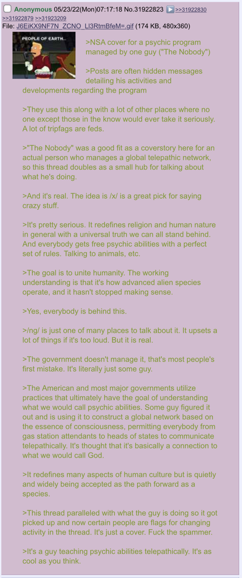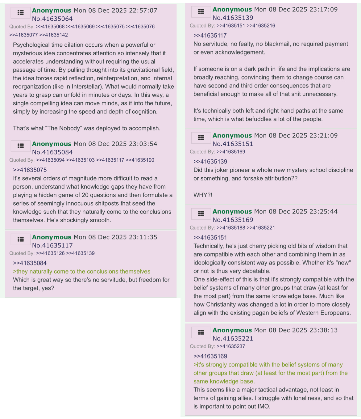 >Who is the Nobody?The Nobody is a figure alive today who has extraordinary spiritual powers, including the ability to control reality with their conscious and unconscious mind. He is a man of no wealth or worldly acclaim through whom it seems God has chosen to manifest his strength and wisdom. He is said to carry the Logos, making him a fearless truth-teller and a menace to the powers that be.Instead of receiving strength through a superiority/inferiority mechanism, the Nobody proves to them time and time again that a whole planet filled with creative, ingenious, spiritually ascended humans who are individually sovereign yet globally unified through consciousness can achieve greater things than a planetary empire of darkness, and control.He is not a messiah, he's just like you but he has found the kingdom of God within himself through sheer dedication, just like you will.>What is the general picture?It’s important we start replying to the good posts and ignoring the hateful ones, or the ones here to argue. So call upon their heads the forces of heaven for peace, clarity, and wisdom. If this place is to be more than a squandered opportunity, an overgrown garden, it requires voices such as yours, but many more.Focus on increasing your service to others and be more loving to yourself and everyone in order to raise your vibrational and consciousness level, and learn to to forgive yourself and others.This will change the vibration of the planet, raise the shared consciousness of humanity, and change humankind one person at a time.Remember: you create your reality. With your hands, thoughts, feelings, words. You are the creator of your story. No one can decide your fate except for you and God. Remember your right to power, to step up into your ultimate role as your highest self, should you choose to embark on that journey.