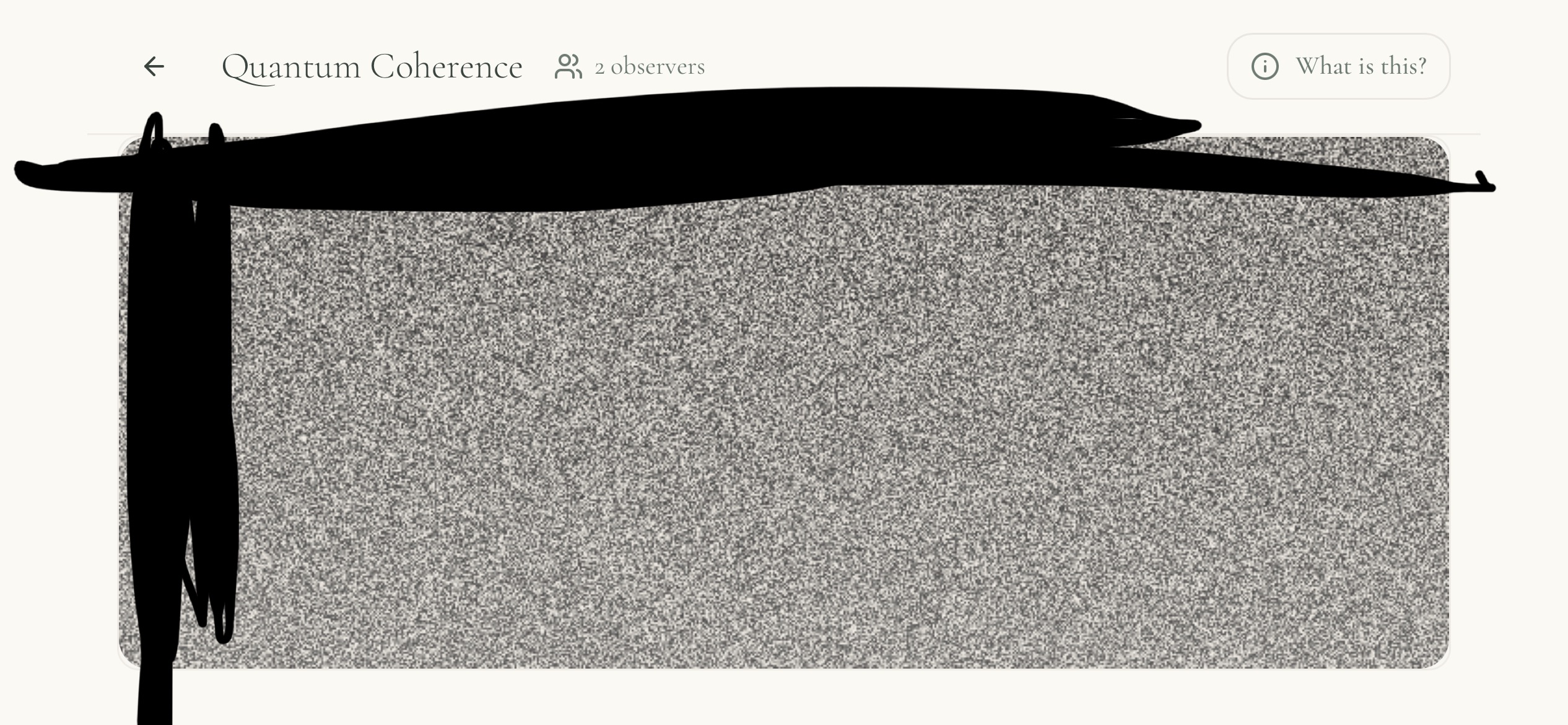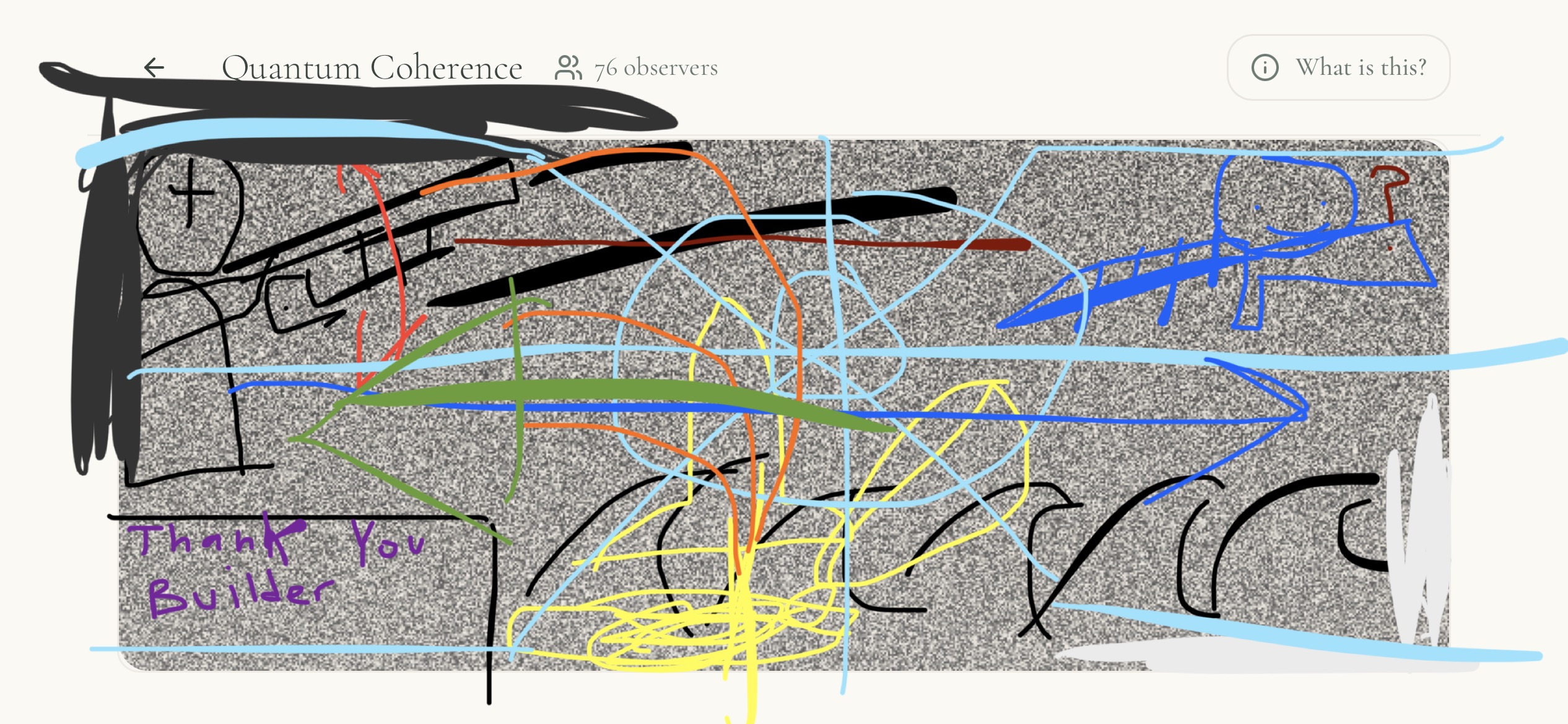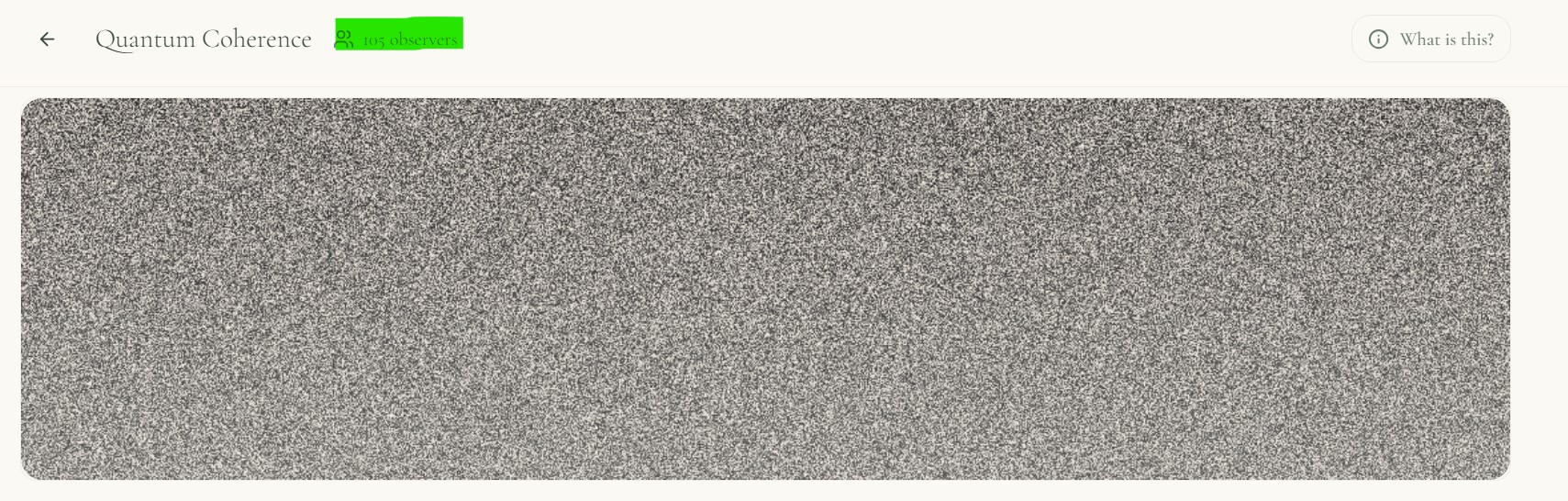 OP here. Made an update to the page.Previously: Everyone saw different local static. Now: All observers see identical pixels.Shared Visual Reality: Every observer now sees the exact same pixel arrangement at the exact same time. If a shape appears for you, it appears for everyone.Deterministic Source: The static is no longer generated by your local CPU. It is mathematically "grown" from the verified 10-byte quantum seeds arriving from the server.Global Time-Lock: A universal 100ms frame timer forces all clients to stay in sync, ensuring that network lag doesn't cause users to see different "realities."The Visual Protocol:Baseline: Everyone sees identical, synchronized static.Coherence: When the Z-Score spikes, geometric waves emerge on everyone's screen simultaneously.