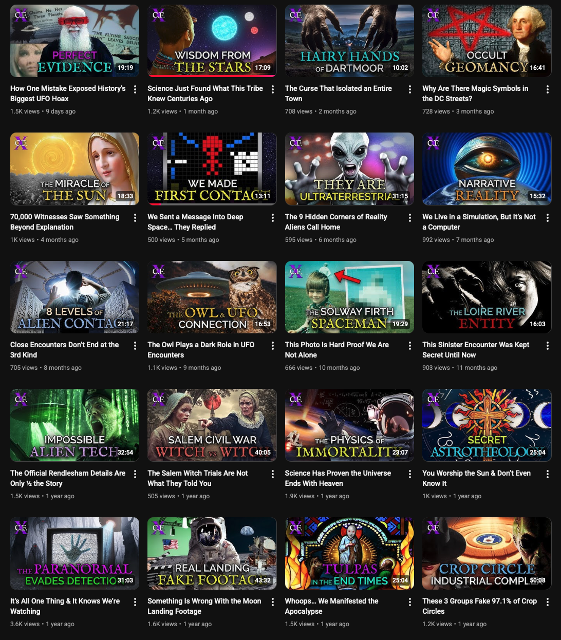 >>41684972Then start subscribing to any channel you come across in the niche, or keep a text file or something. Picrel is one I've been into lately. Highest production value, being buttfucked by Youtube.> https://www.youtube.com/@TheCaseFileX/videosCovers Aliens, Occult, Religious, Fringe Science, and all that jazz