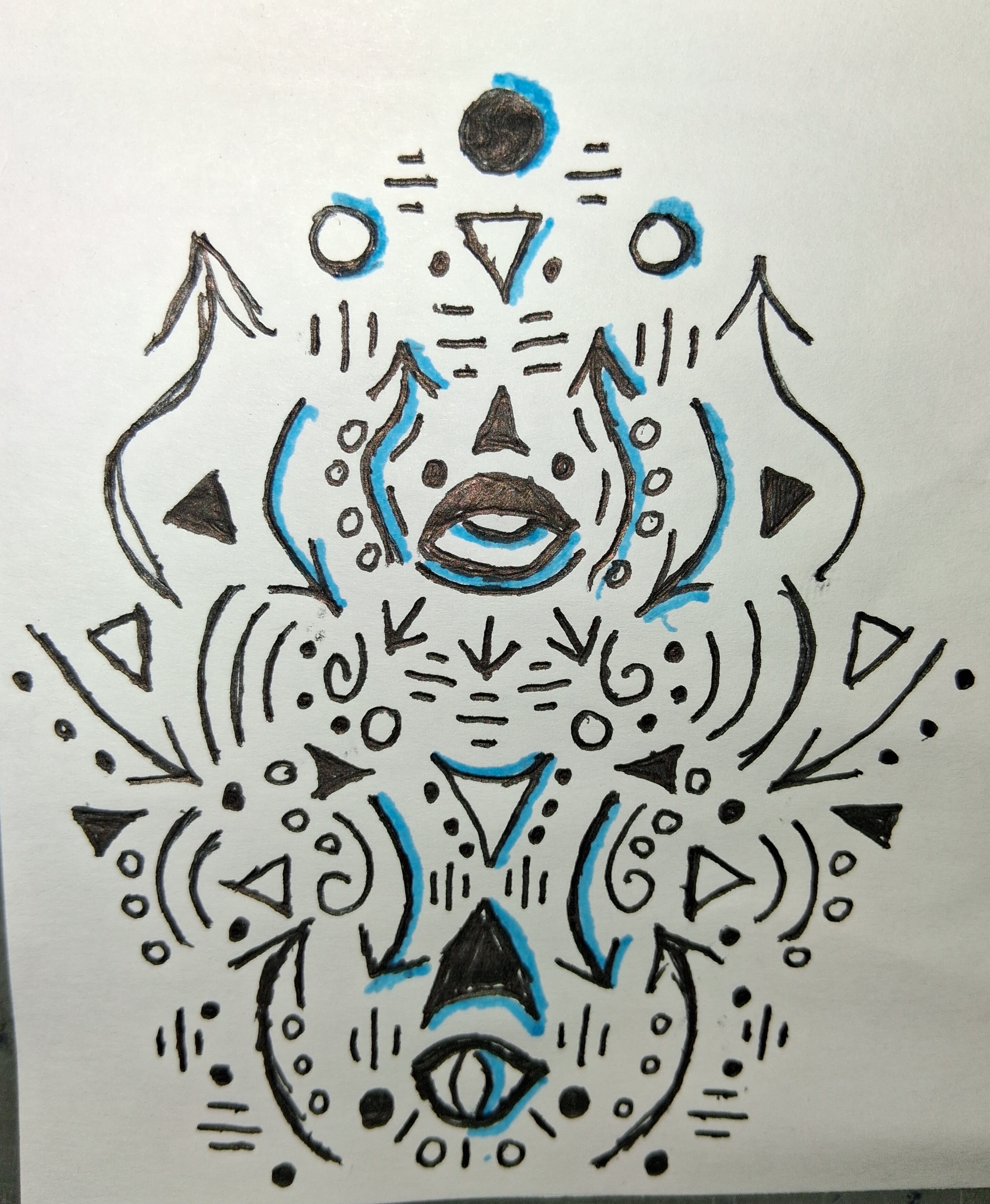 >>41785522That is a good question I often found myself asking what it all meant, especially since the lines come so naturally, it is almost like release to get them on paper and out of my headWhat I ended up believing and still do is that this is similar to a 2D rendering of a 3D structure, but possibly it is a very basic 2D drawing of 4D structures As an example i would personally interpret your work as this:Its a symmetrical structure so i would say the bulk of it is from the 3D material plane, the slight differences in the symmetry are entropy or chaosThe blue shading is interesting because it is on the same side on both symmetries, this means that an external force is shining from one direction, creating something like a shadow on the 3D material world, from the same direction regardless of the symmetry, so the shining force is from beyond 3 dimensional space, possibly the astral or ethereal The triangles and arrows feel like forces creating eddys I would say your work is about 3 dimensional forces creating patterns or eddys, and a shining force from beyond the material plane creating blue shadowsBut its really up to you, Awesome work though!!! Saved, definitely a keeper