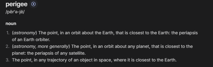 >>41693112ok, you are a troll.so, by your reasoning:the ONLY way for it to be the point, in any trajectory of an object in space, where it is closest to the Earth; it FIRST has to be:>in an orbit about the EarthTHEN it has to be:>in an orbit about ANY planetso...it has to orbit earth, get close to it, then orbit another planet, then get close to it, for it to FINALLY be the third definition? cause that would be the only way to satisfy the first 2 definitions, to allow the third definition.