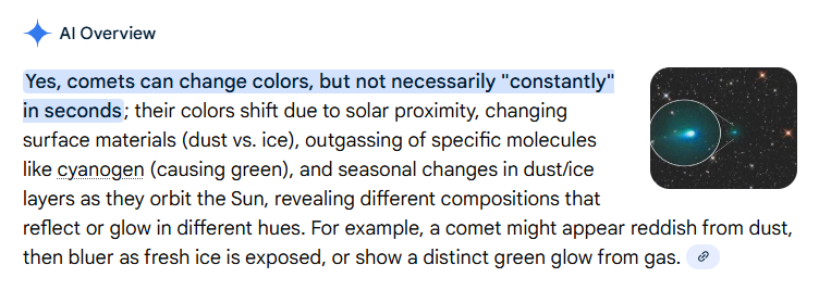 >>41694482>So, while they don't flicker like a lightbulb, comets display noticeable color changes over days, weeks, or months, reflecting their dynamic interaction with the Sun and their own changing composition. Meanwhile 3I/Atlas changing colors every 16mins