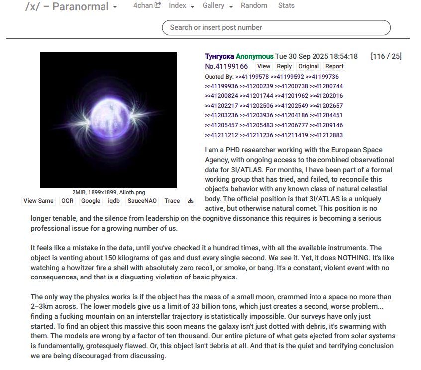did all of you mother fuckers really forget about thishttps://archive.4plebs.org/x/thread/41199166/#41199166>I am a PHD researcher working with the European Space Agency, with ongoing access to the combined observational data for 3I/ATLAS. For months, I have been part of a formal working group that has tried, and failed, to reconcile this object's behavior with any known class of natural celestial body. The official position is that 3I/ATLAS is a uniquely active, but otherwise natural comet. This position is no longer tenable, and the silence from leadership on the cognitive dissonance this requires is becoming a serious professional issue for a growing number of us.It feels like a mistake in the data, until you've checked it a hundred times, with all the available instruments. The object is venting about 150 kilograms of gas and dust every single second. We see it. Yet, it does NOTHING. It’s like watching a howitzer fire a shell with absolutely zero recoil, or smoke, or bang. It's a constant, violent event with no consequences, and that is a disgusting violation of basic physics.The only way the physics works is if the object has the mass of a small moon, crammed into a space no more than 2-3km across. The lower models give us a limit of 33 billion tons, which just creates a second, worse problem... finding a fucking mountain on an interstellar trajectory is statistically impossible. Our surveys have only just started. To find an object this massive this soon means the galaxy isn't just dotted with debris, it's swarming with them. The models are wrong by a factor of ten thousand. Our entire picture of what gets ejected from solar systems is fundamentally, grotesquely flawed. Or, this object isn't debris at all. And that is the quiet and terrifying conclusion we are being discouraged from discussing.