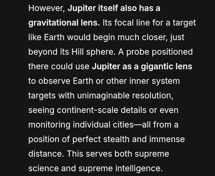 >>41696228If it drops an asset we can see, near Jupiter, then this is a 50/50 on worst case scenario.Same if Juno goes offline mysteriously.Best case from there, they want us to come meet them, BUT they don't want to come here, from that position in our solar system, they are acting with some level of authority, beyond the scope of our civilization.We aren't even thinking about the position, from a strategy standpoint.We don't have a defensive asset in place there.It's one of the most valuable positions in our entire solar system, for asserting dominance over the whole solar system.