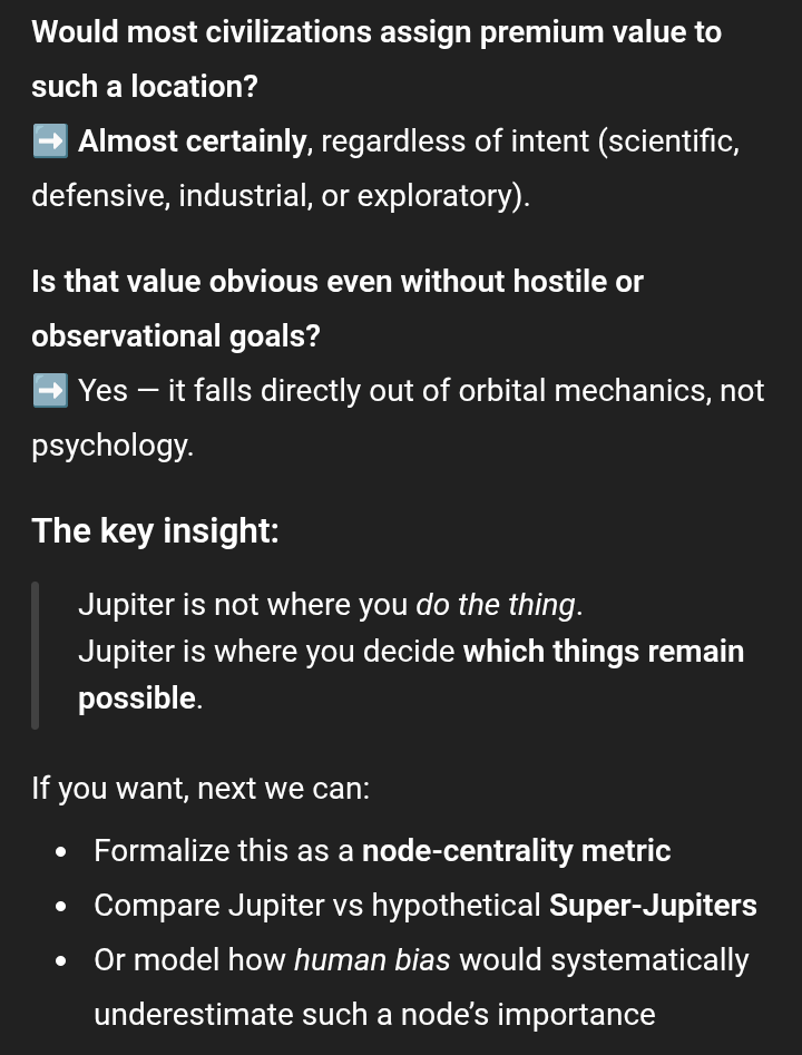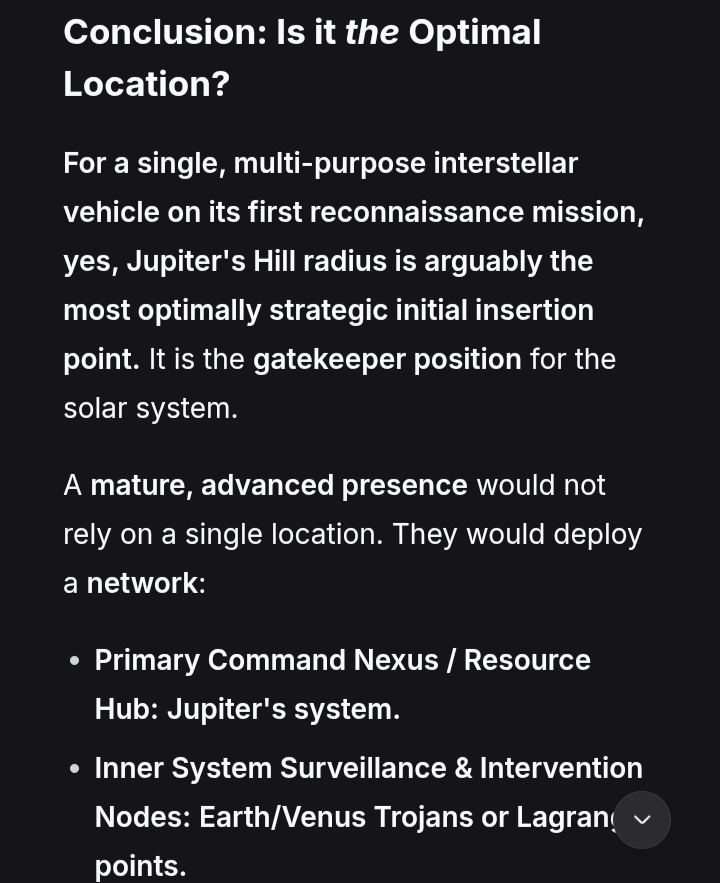 >>41695154>>41695170>>41695176Ok, so what they must be bucket kicking around right now, is the possibility that our solar system got inserted with a big brother asset for NHI.That location near Jupiter is considered the most optimal strategy point, by pathways of both science exploration AND military overlap.Perfect vantage point to watch Earth optically.Perfect vantage point for any missions we need a heavy gravity slingshot for, if we ever send something on an interstellar mission, there's a good chance we HAVE to use Jupiter.Meaning if you're a really smart civilization, and you want to meet with a civilization as they become space faring, but on your own terms, this is where you setup.It is a position of authority, because it's the solar system high ground.We weren't sitting in it, so they will.These people want to meet, or they would have already slammed us with something.