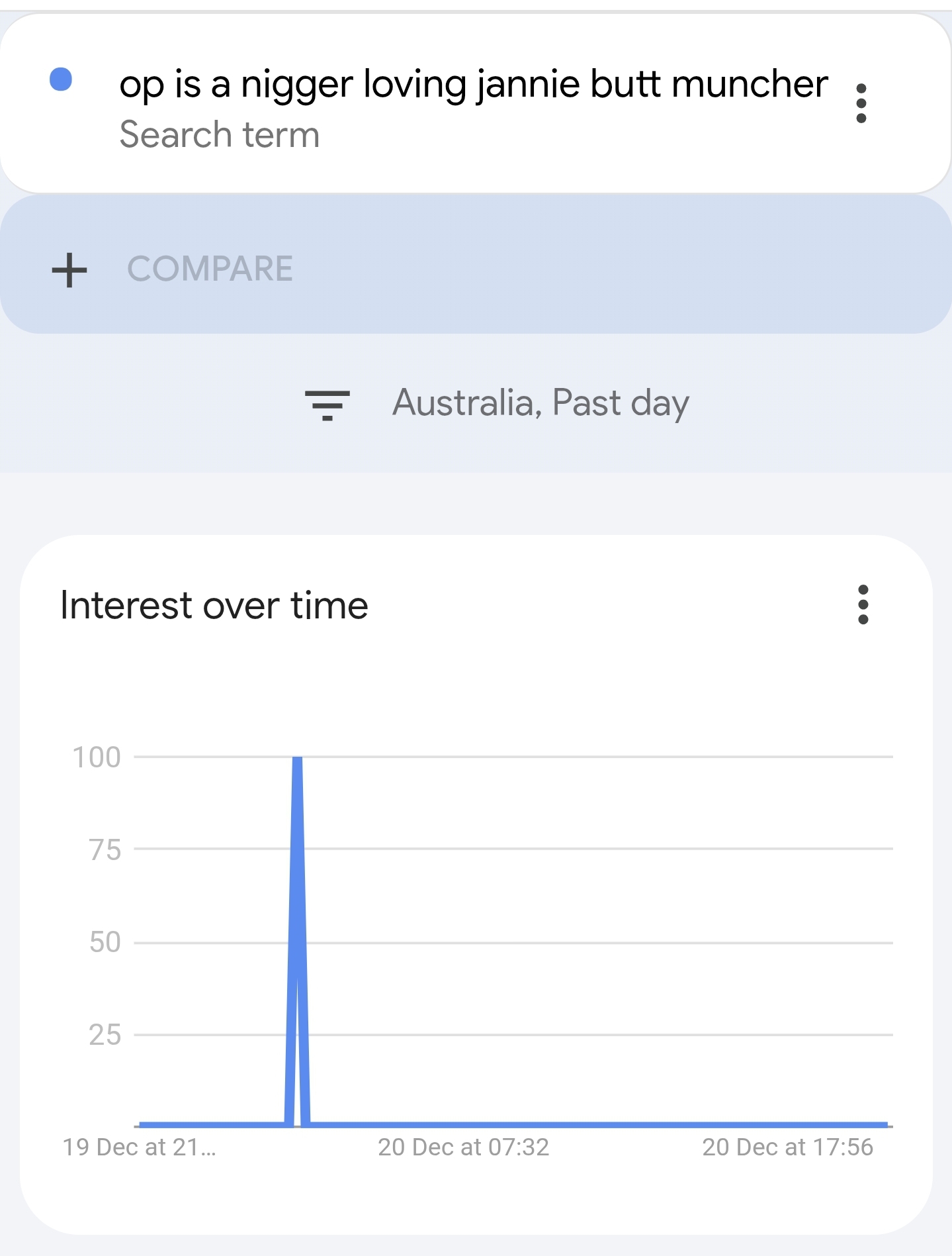 Can anyone other anons confirm something for me? I saw a video saying how using Google Trends, you can see how disasters such as Bondi Beach or related events were seen searched primarily in Israel days before or in advance to the tragedy occurring. I was messing around with it with I decided to put my name in it, followed by assassination, it rendered an immediate 100 results in the past 24 hours. I noticed this was in only 'Worldwide', so after changing the location to Israel is said the same exact thing. I have never posted anything any of my social medias anti-Israel nor do I really speak of them. Does anyone else get the same result? I dont have a very common last name, and I tried the the same thing with both randomly generated named and names of people I knew personally. The randomly generated names resulted nothing while the names of people I knew IRL over the years rendered the same result as mine, specifically in Israel. There's actually no way for this to make sense, unless everyone is getting searched up under this search result. Please post results to let me know if me and my loved ones are fucked or if this is something stranger than anticipated.
