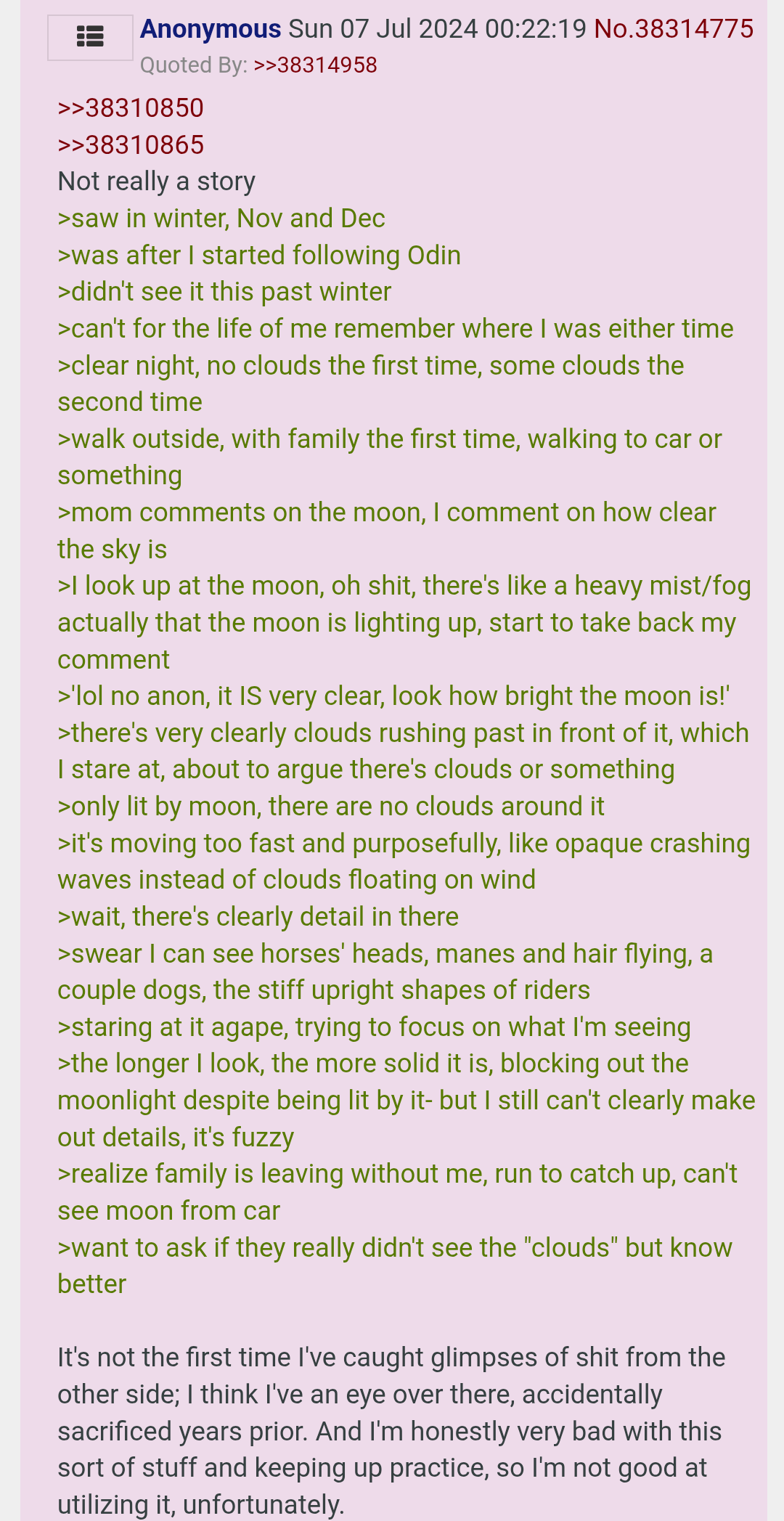 >>41710931>I saw the Wild Hunt twice in my life with my own eyes. It's mesmerizingCould you elaborate on this? I'd be fascinated to hear more on what you saw and how you came to encounter them?