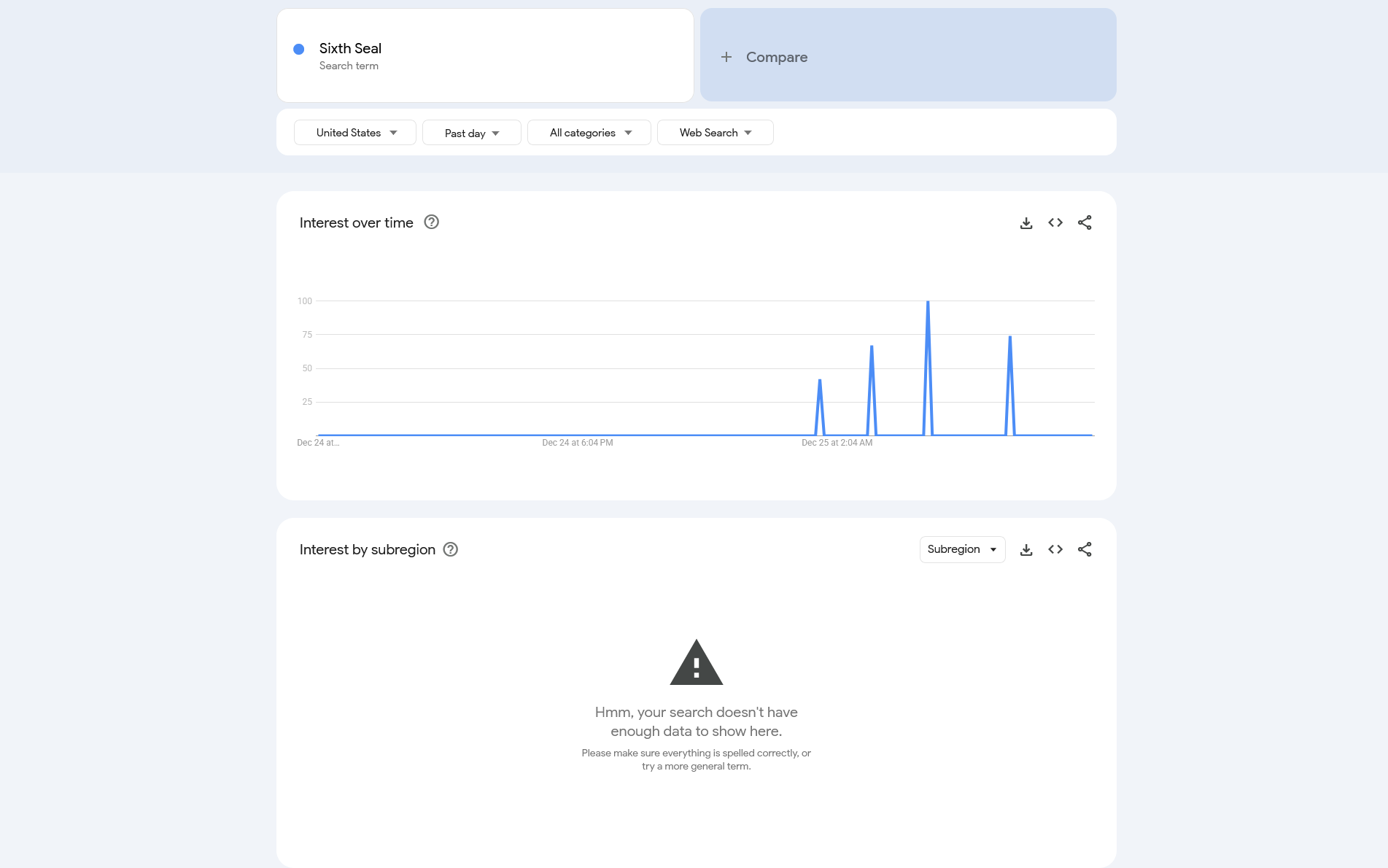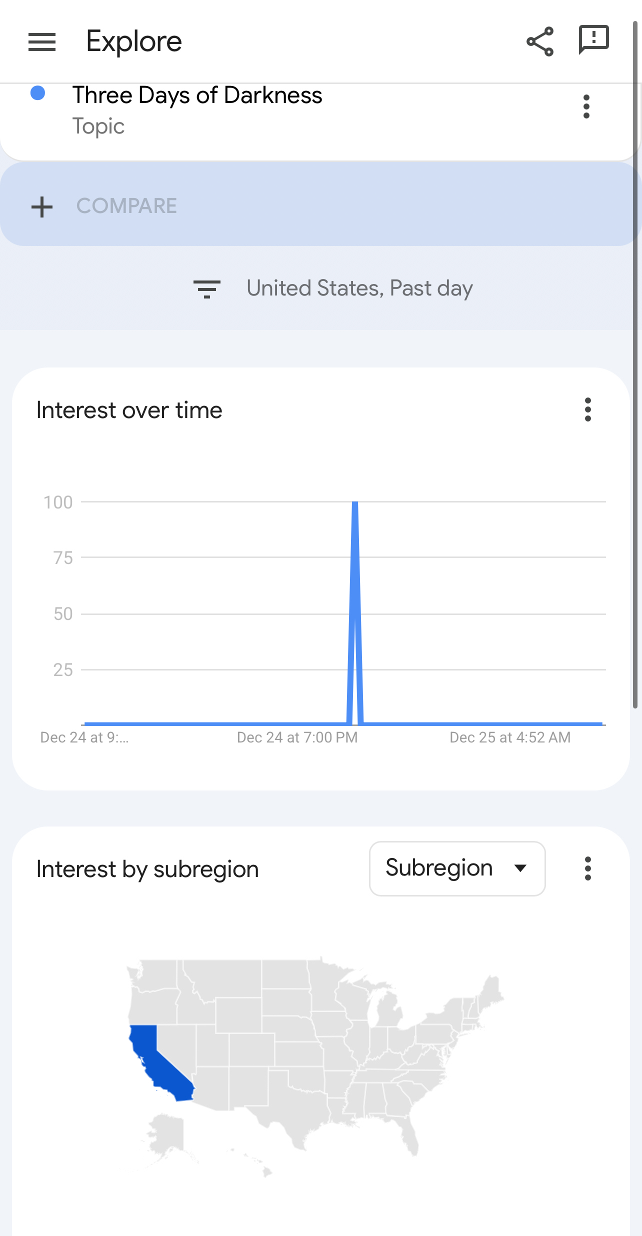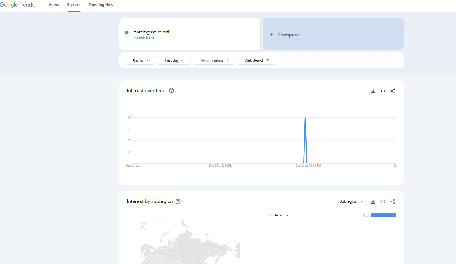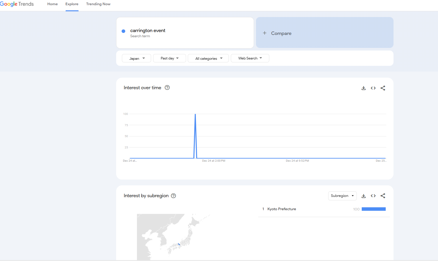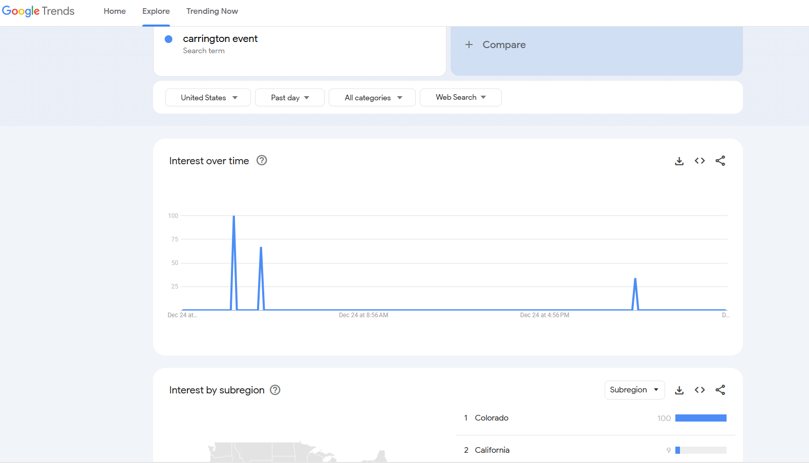 So i was messing around with google search analytics and happened to see a spike in searches for Carrington event at 4:24 am yesterday. The area with the most searches was Colorado where a lot of US space force bases are located.