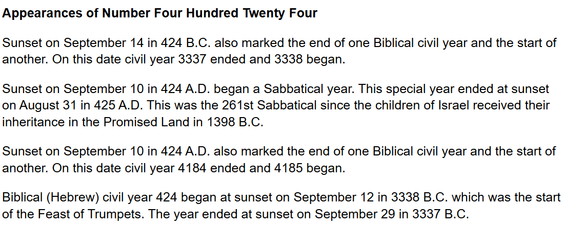 >>41715353Got interested in 4:24>Sunset on September 10 in 424 A.D. began a Sabbatical year. This special year ended at sunset on August 31 in 425 A.D. This was the 261st Sabbatical since the children of Israel received their inheritance in the Promised Land in 1398 B.C.>Biblical (Hebrew) civil year 424 began at sunset on September 12 in 3338 B.C. which was the start of the Feast of Trumpets. The year ended at sunset on September 29 in 3337 B.C.