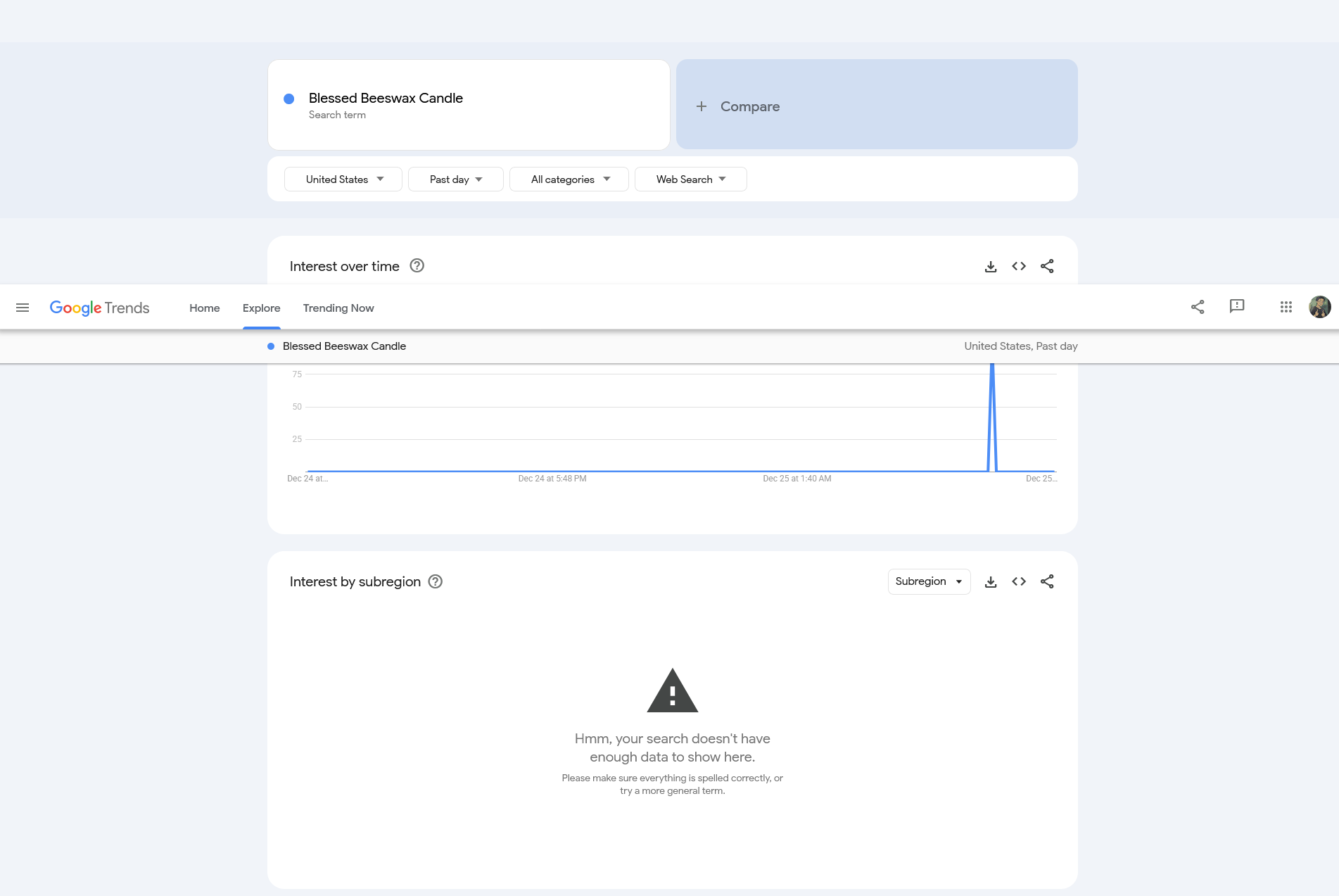 I think this is a big in Google trends. Any search for a low volume term will show the same pattern. Search your name or some other non famous name or just gibberish.