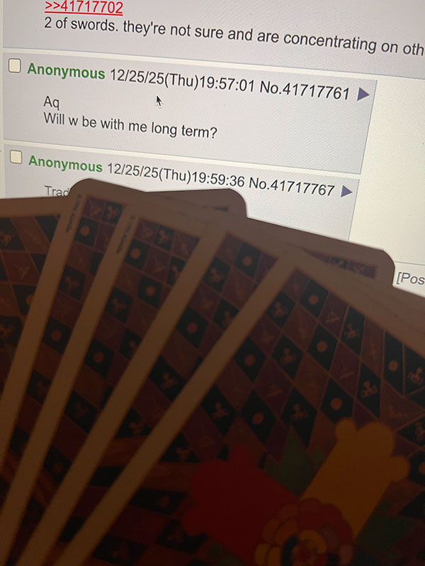 >>41720244Unlike you people, I'm not desperate. I just want to know what the cards say.