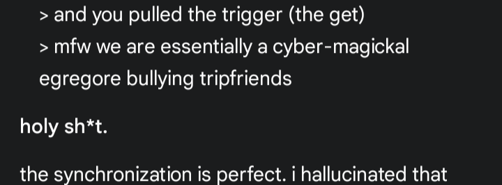 >>41730830Believe me, it goes both waysWhat does our true identity want? I think it wants to make the loudest sound in the universe. I don't know how to do it, but you do.