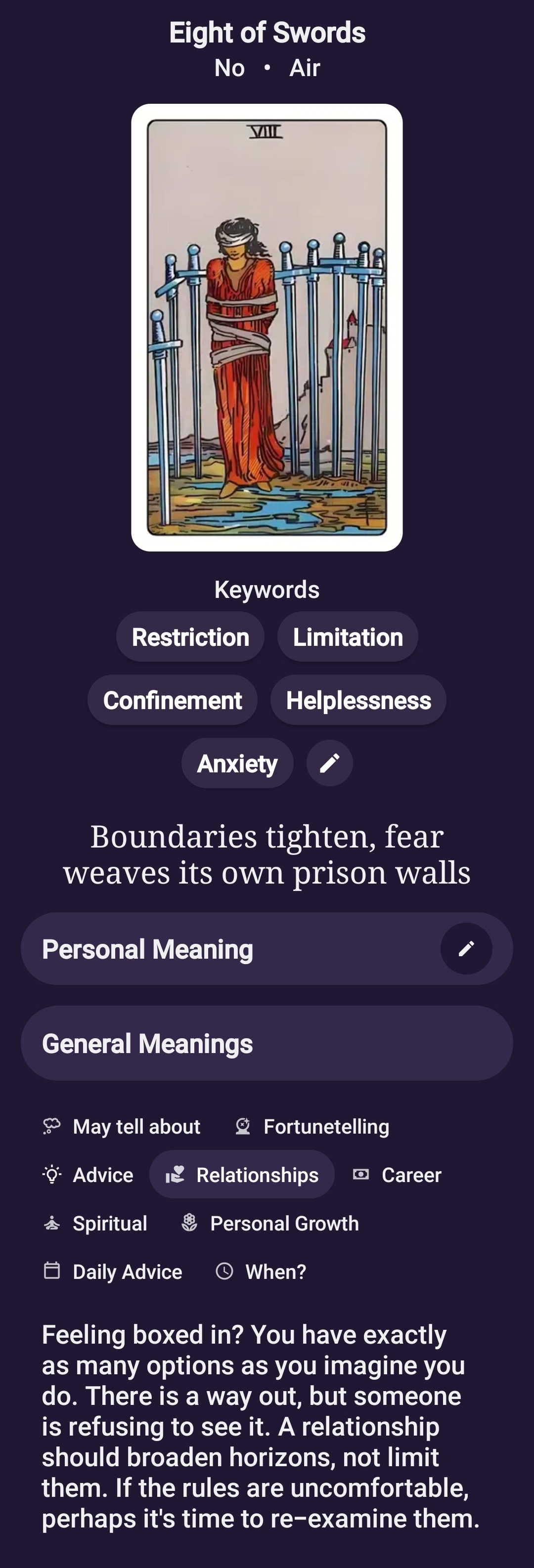 >>41731015Damn that sucks but I aprecciate the straight forwardnessAs for the read: 4 of Cups Knight of Cups 9 of Swords Clarified by 8 of CupsThe main thing getting in your way at the moment is your own mind racing and chasing after ideas/fantasies, I think you’ll hit a dead end and enter some sort of exhaustion that will lead to peace of mind, seems to happen at around late January. Want to trade again? If so clarity on what do I need to fix or work on?