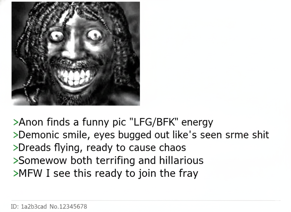 >>41736426That’s a good one. Whoever made that one is fucking hilarious. I wish I could remember the day that was made. I’m not gonna go to the archives and see what that guy was saying though, he was probably unknowingly smoking weed laced with PCP.