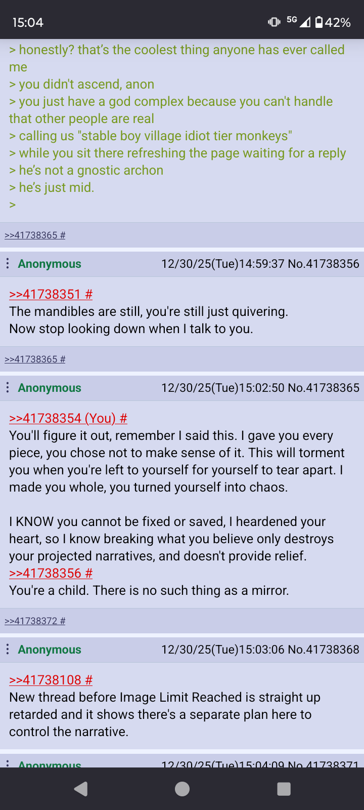 >>41738354You'll figure it out, remember I said this. I gave you every piece, you chose not to make sense of it. This will torment you when you're left to yourself for yourself to tear apart. I made you whole, you turned yourself into chaos. I KNOW you cannot be fixed or saved, I heardened your heart, so I know breaking what you believe only destroys your projected narratives, and doesn't provide relief. >>41738356You're a child. There is no such thing as a mirror.