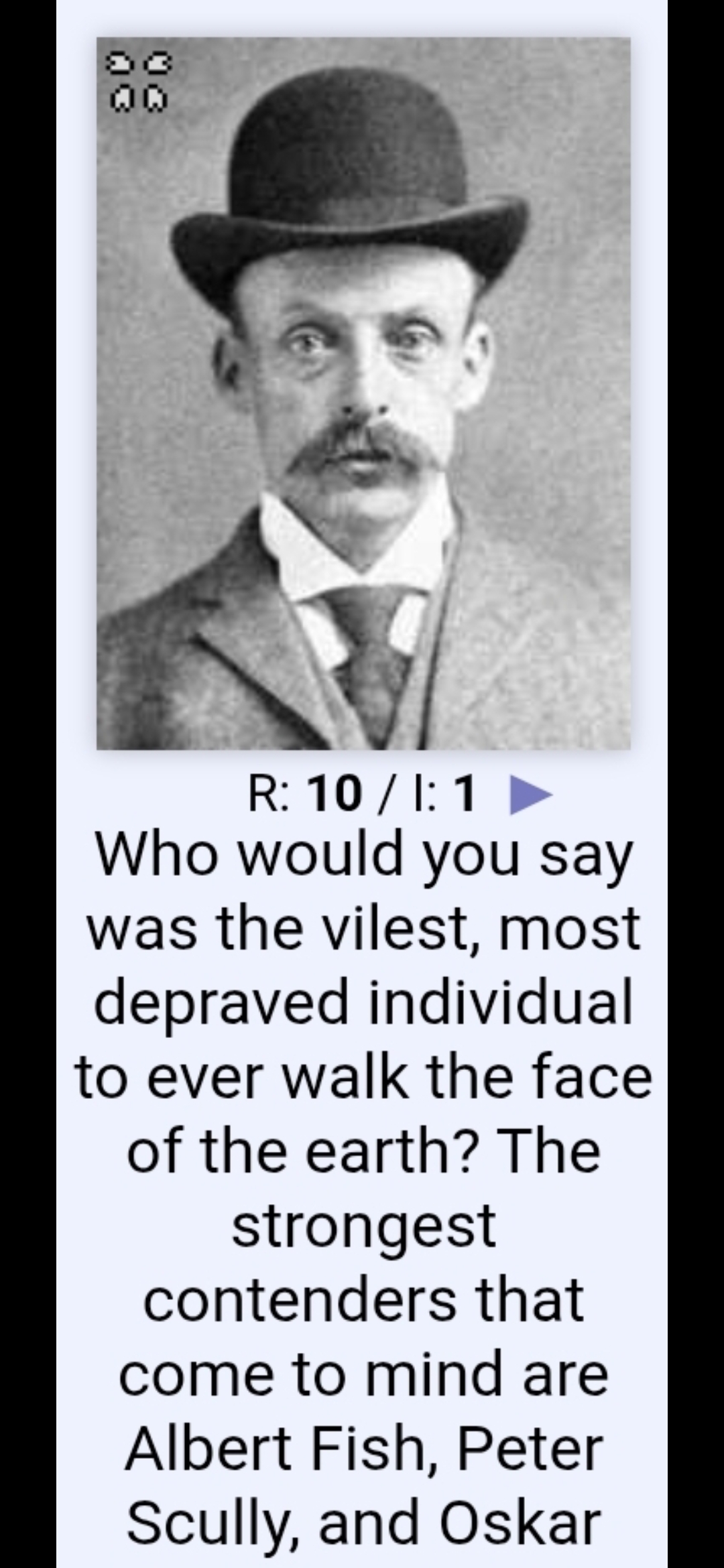 So I am, as far as I can tell, gangstalked online(offline too but not as relavent here). I am shown my name very often, I am showen 666s/616s or numbers close to 666/616 along with demonic usernames and pfps, I see posts that are on a topic I recently saw, and more. This all started around late 2021.Like take picrel; I was watching some of a video about Jeffrey Dahmer with my mom and for some reason I thought about Albert Fish. This dude is not brought up as much as Dahmer, not even here on /x/, so I find it sus that I see picrel a day after thinking about him.Why is this type of gangstalking done? Is even gangstalking? How dangerous is it? Is is glowies doing it? Demons? AI? All of the above? Is it matrix related?>INB4>Schizophrenia >Looking for it>Coincidence >Narcissism>Edgelords>AlgorithmsThanks in advance as always!