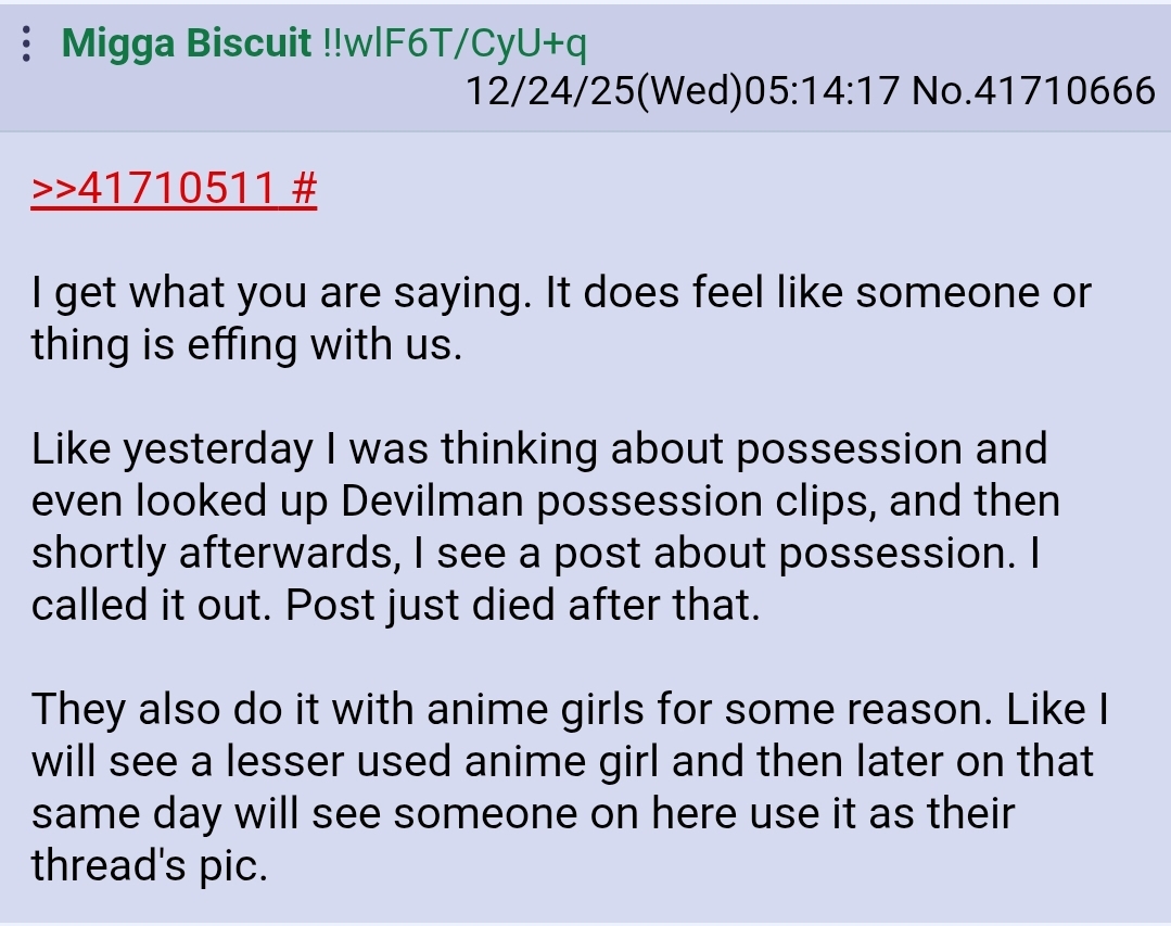 >>41770195I see your point, but when it happens, you know, you just sense something is off. Heck, sometimes it slaps you to the point it is impossible to ignore it.Like for example, a non online example, so even weirder, I was near the milk at the store. Seconds later I hear a mom and son discussing my very obscure fear. Like so obscure less then 10 people probably have it as well. And the object is not commonly talked about. Like they said they would do magic tricks with them. That was straight up gangstalking. Like so blatant it was actually kinda funny.
