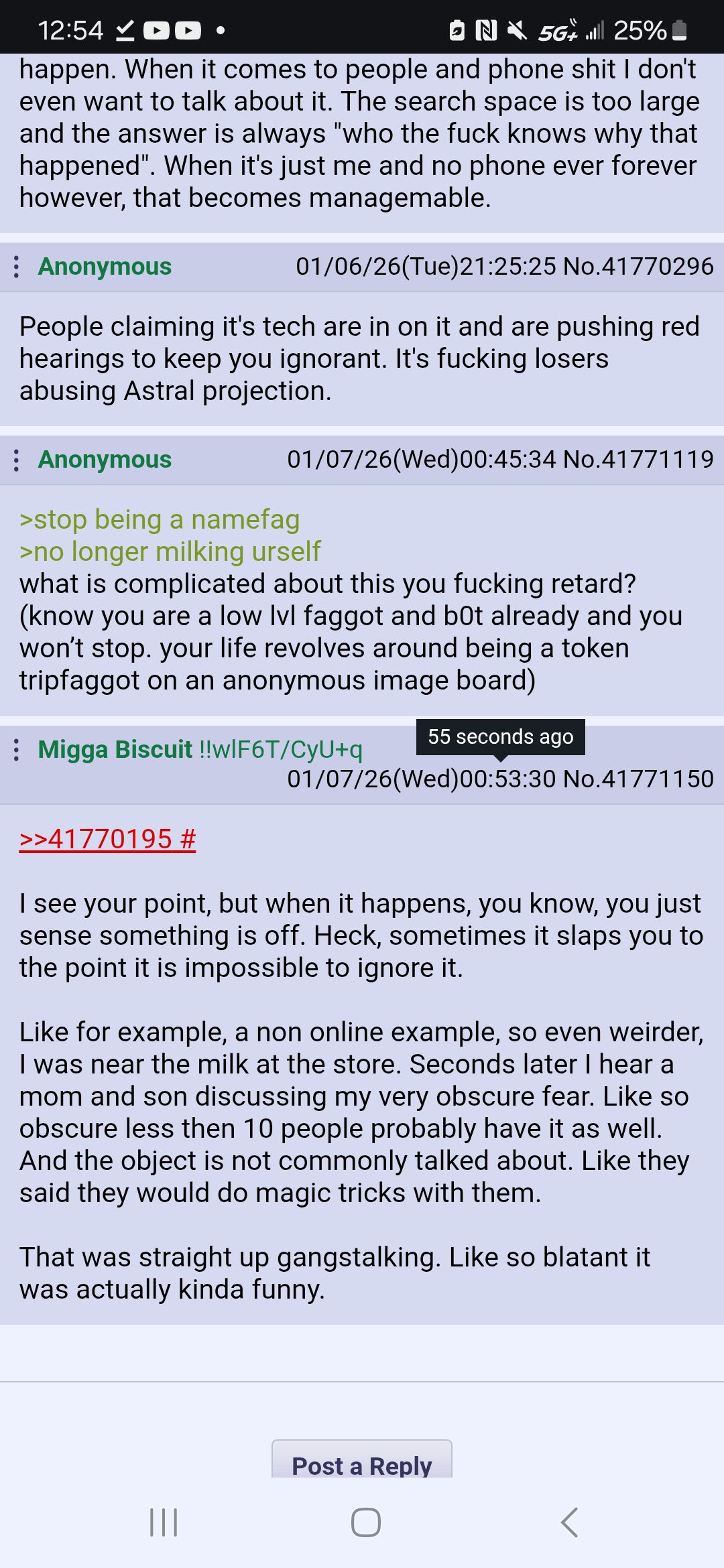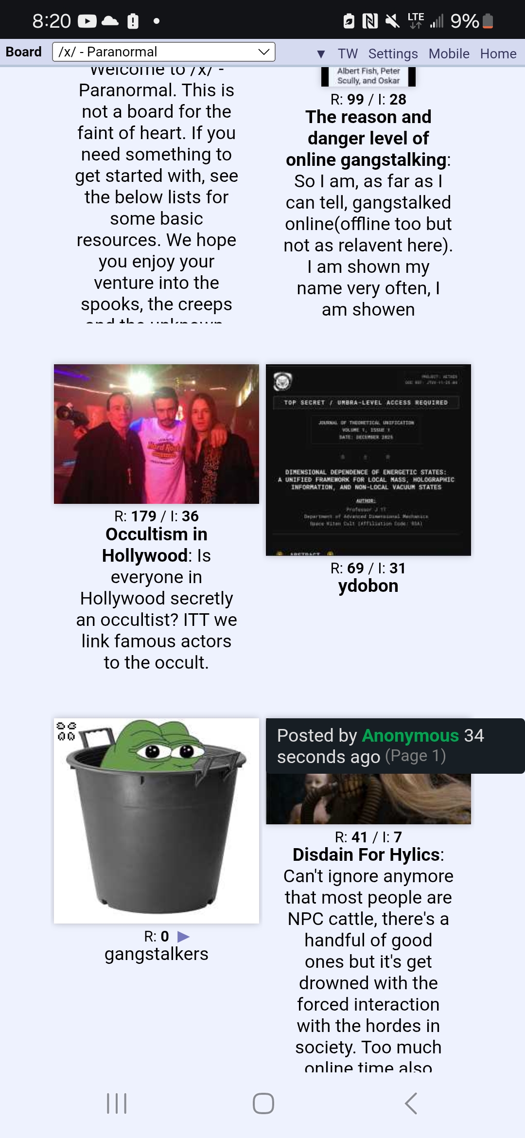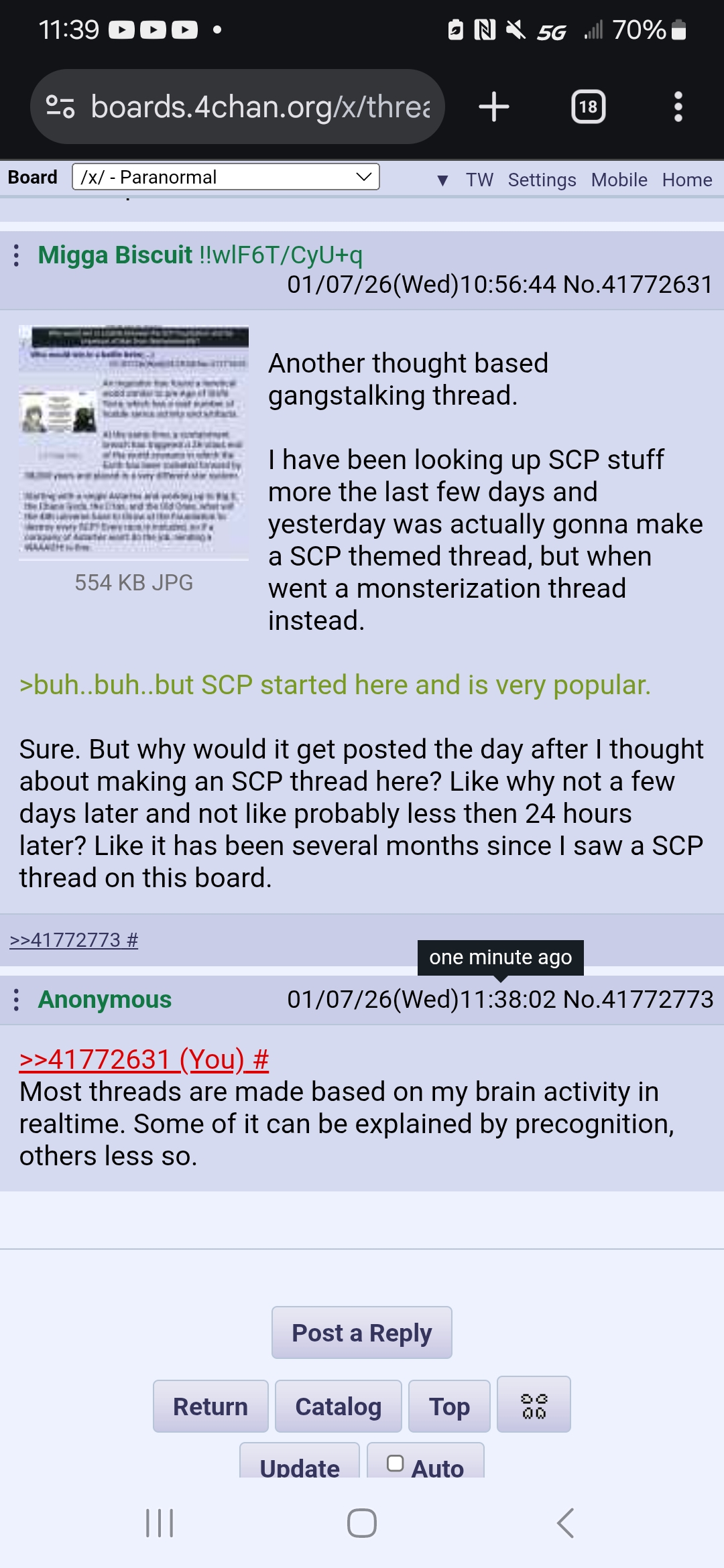 Another thought based gangstalking thread.I have been looking up SCP stuff more the last few days and yesterday was actually gonna make a SCP themed thread, but when went a monsterization thread instead.>buh..buh..but SCP started here and is very popular.Sure. But why would it get posted the day after I thought about making an SCP thread here? Like why not a few days later and not like probably less then 24 hours later? Like it has been several months since I saw a SCP thread on this board.