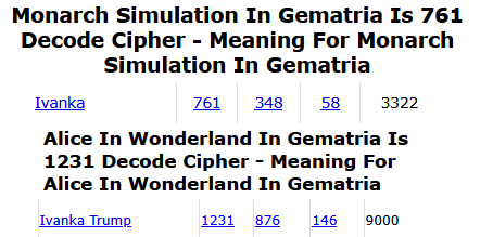 Sup faggots. I'm OG Thundernuts and I'm here to expose the truth behind the conspiracy!Ivanka Trump is a monarch mind control asset. She's Alice in Wonderland. We have to warn them because she is surrounded by freaks.Satanists are using Gematrix to communicate with each other. I think I connected the dots on something..Discuss.Feel free to share Gematrix finds here.