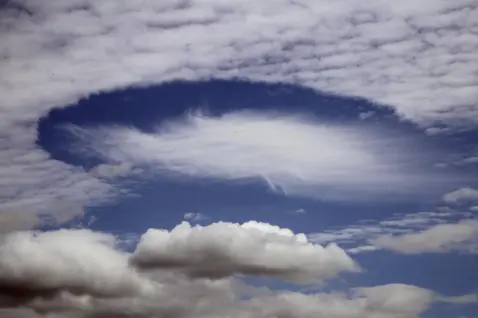 >Bright, sunny afternoon>Outside in my driveway>It's very quiet around my neighborhood>Suddenly, the wind starts picking up fiercely into gusts>My hair and clothes are whipping around>Look up into the sky>Thin overcast of clouds, but a fallstreak hole kind of phenomenon occurs directly above>Literally watching it form as the clouds "dissolve" to form this hole>Woman that I've never seen before comes from the sidewalk >"It's terribly windy out. You mind if I come in?" >"Sure.">Lead her indoors>My house looks NOTHING like my real one>The floor plan and layout is completely different yet I am familiar with it>TV is on in the living room, and I can hear the news talking about high speed winds>She goes to sit down and watch>Can literally hear the gusts blowing around outside as an updraft occurs>Go to "my" bedroom and lay down in bed, staring at the ceiling>Can hear the winds making my house creak as it stress out the structure>Close my eyes, and wake up in reality