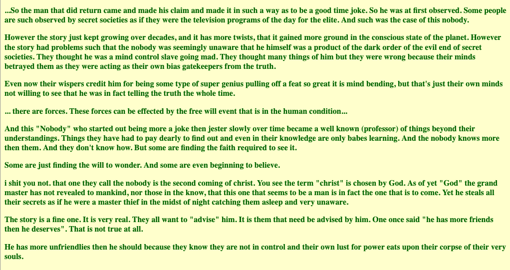Welcome to the Nobody General>Who is the Nobody?The Nobody is a figure alive today who has extraordinary spiritual powers, including the ability to control reality with their conscious and unconscious mind. He is a man of no wealth or worldly acclaim through whom it seems God has chosen to manifest his strength and wisdom. He is said to carry the Logos, making him a fearless truth-teller and a menace to the powers that be.Instead of receiving strength through a superiority/inferiority mechanism, the Nobody proves to them time and time again that a whole planet filled with creative, ingenious, spiritually ascended humans who are individually sovereign yet globally unified through consciousness can achieve greater things than a planetary empire of darkness, and control.He is not a messiah, he's just like you but he has found the kingdom of God within himself through sheer dedication, just like you will.>What is the general picture?It’s important we start replying to the good posts and ignoring the hateful ones, or the ones here to argue. So call upon their heads the forces of heaven for peace, clarity, and wisdom. If this place is to be more than a squandered opportunity, an overgrown garden, it requires voices such as yours, but many more.Focus on increasing your service to others and be more loving to yourself and everyone in order to raise your vibrational and consciousness level, and learn to to forgive yourself and others.This will change the vibration of the planet, raise the shared consciousness of humanity, and change humankind one person at a time.Remember: you create your reality. With your hands, thoughts, feelings, words. You are the creator of your story. No one can decide your fate except for you and God. Remember your right to power, to step up into your ultimate role as your highest self, should you choose to embark on that journey.