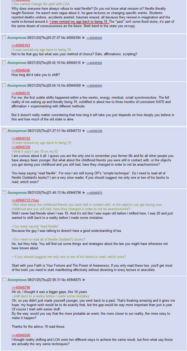 >>41799028>>41799304Revision does t do that. It’s simply a mental outlook technique. You larpers never actually read Neville properly. Nothing physically changes with his revision technique. The past remains the same.
