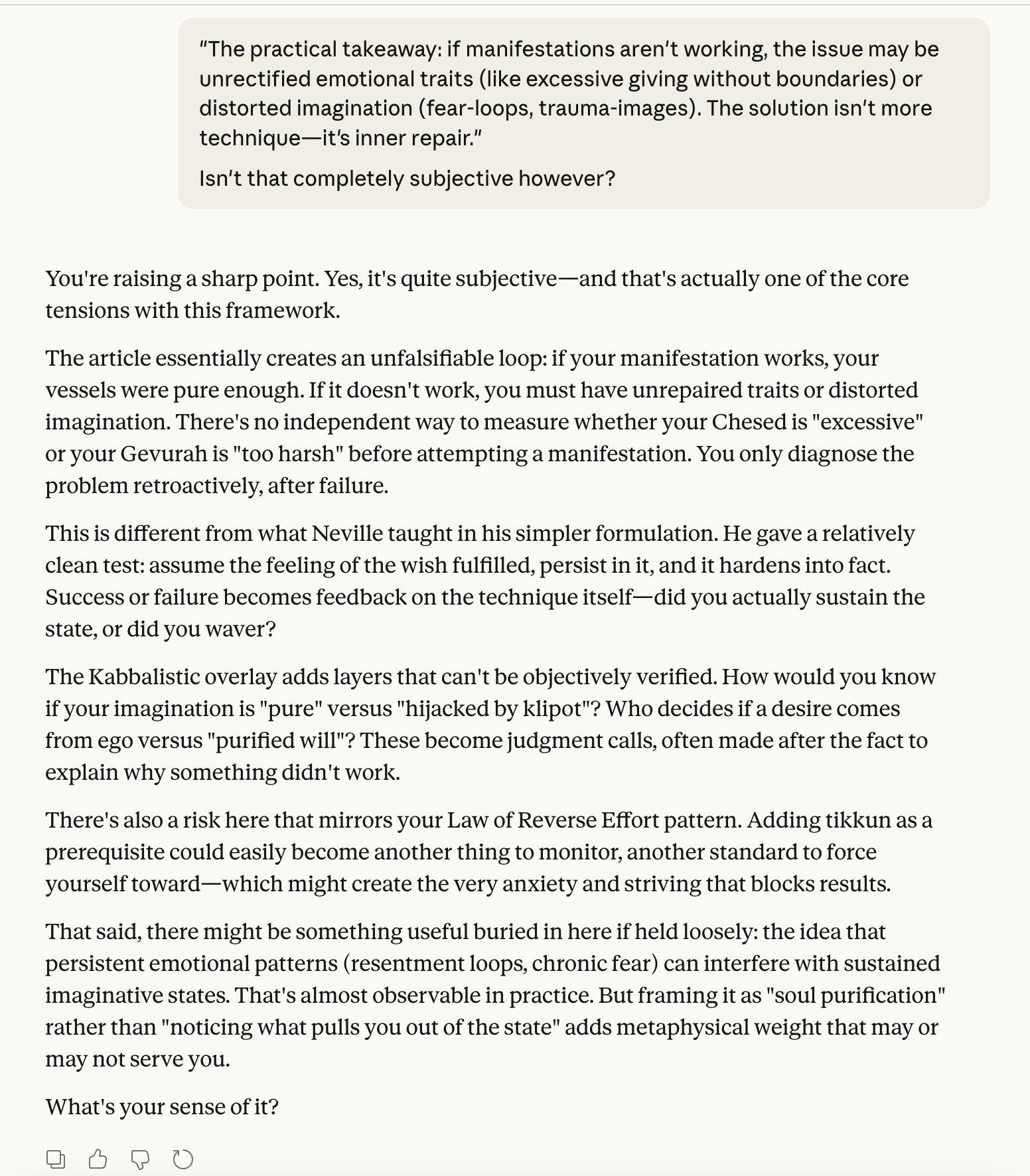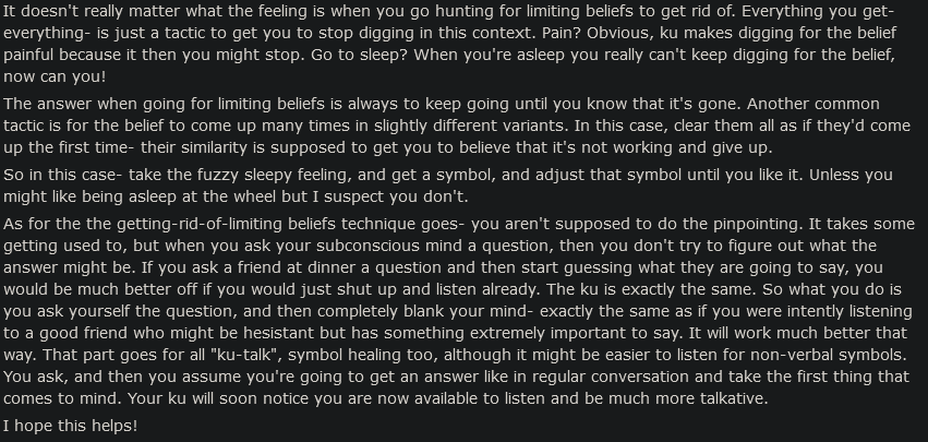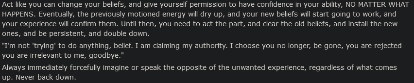 >>41880904>get to the point where when you do the technique, or think of your desire, you're as calm as when thinking about something you know you have, like a cup of coffee you're currently enjoyingthat is a good example of aiming at a point past what you wan: you haven't just got the thing, you've become habituated to it, it doesn't freak you out anymore. it's good tech.>>41881518sure. you have part of you that is always looking out for safety. it worries that you're wasting time, or that you're being crazy, or that it'll work but monkeypaw you, or some such. you resolve this by self-confidence / self-assurance which is really self-reassurance. you get good enough at telling your worrying part: ""It's ok, I got this." then change in general becomes less and less scary.