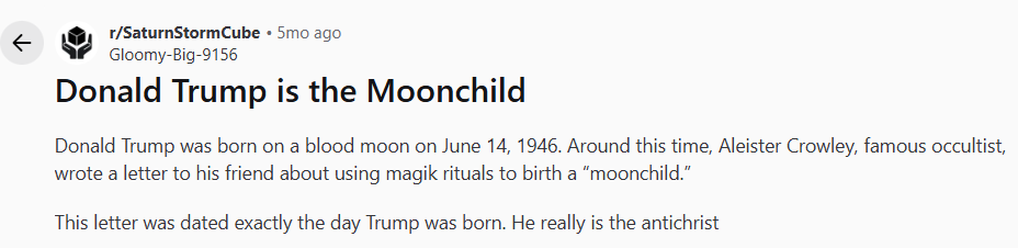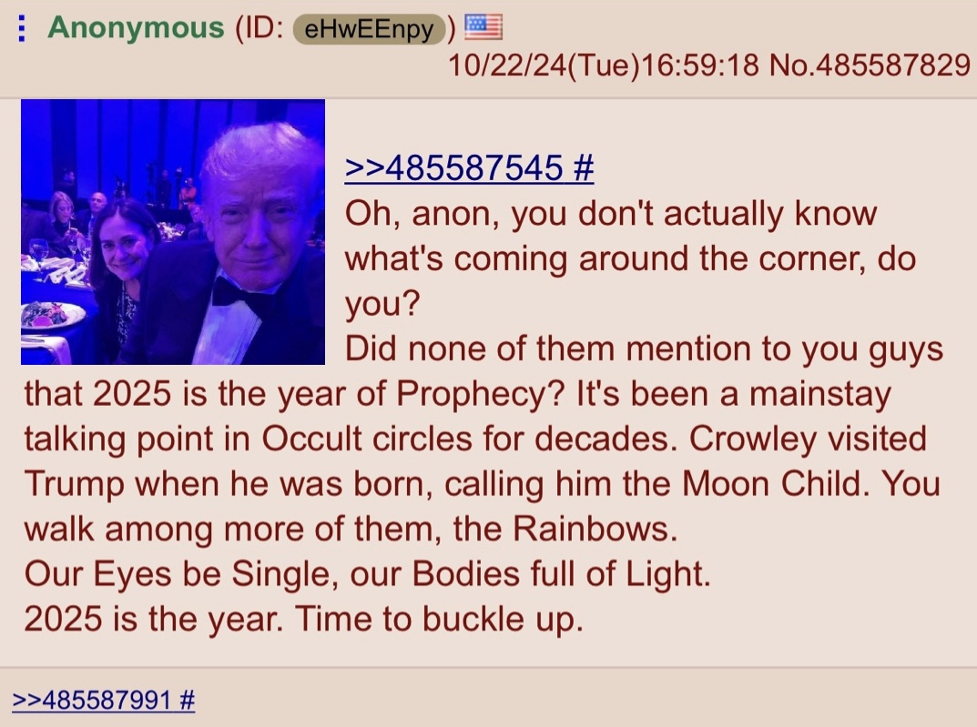 >>41809938The entire U.S is basically run like Dune, but less cool and really incompetent at all levels. Magi across the states and within the other two super powers and some other western nations, all connected to government, have tried to create their own messiahs/antichrists. The reasons for this are many, but the "aeon" in magical parlance isn't just a period of time. It's also that a new magical law and state of order come into being. Governments and some ultra wealthy are intensely interested in this, for obvious reasons. The top three contenders who have failed for manifesting a moon child (as human) >Jack parsons While he did not succeed in creating a human avatar for the thelemic antichrist, he considered himself successful for having summoned in the force that would create a witchcraft religion movement. Which was his ultimate purpose in trying to trigger a new aeon. This was accompanied by a war and manifestation of UFO phenomenon. >L. Ron Hubbard Convinced himself he was Satan and tried for the majority of the rest of his life to manifest the thelemic antichrist. Total failures across the board. Excluding somewhat scientology, which is meant to act as a long lasting curse against the population while harvesting loosh. Top tier scientologists still trying to summon the thelemic Antichrist and run breeding farms for folks like Tom Cruze for this purpose. >Charles Leadbeater Theosophists attempted to incarnate a new avatar, that they could then control and use to shape the world according to the ideals of theosophists. They succeeded in birthing someone with high magic potential, but fumbled else wise. The ultimate failure of this was that their promised avatar rejected them entirely and then sort of melted away into obscurity.