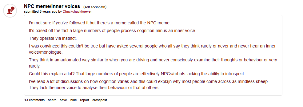 Ways it might be possible to scientifically test if someone has an inner monologue or is an NPC:https://www.youtube.com/watch?v=3gvwhQMKvro