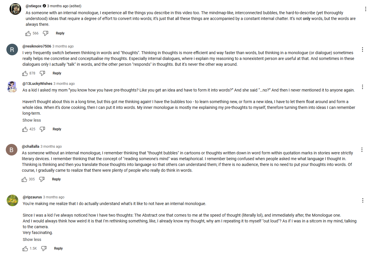 >>41812669I'm curious if inner monologue is just one of the many mechanisms of self-awareness instead of it just being "oh you're an NPC"One of my friends said he doesn't have an inner voice but he thinks in "concepts"