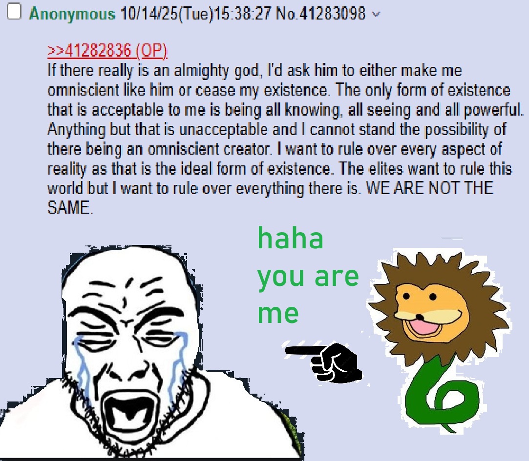 >>41836372No Im conscious >>41836369Thank you. I have free will tooEven in the best case scenario from the view of free-will/self-determination, there's at best a chance of swinging the probability of being summed up as "good" or "evil" in the grand scheme of things. If the multiverse is absolute and all possible things happen exactly once, there is no good or evil that any "actor" within that can be; similarly if the multiverse doesn't exist and it's all deterministic there is no good or evil that any actor within that can be; in both cases "good" and "evil" were intrinsic to the system when it was created. The one potential exception here is if the probabilities of experience for individual actors within the multiverse can swing one way or another by their own will power: essentially control over time from an experiential perspective; in that third case absolute good/evil would still likely be entirely impossible, however it might in some very slight or very extreme manner, dependent upon the level of individual control over experiential probabilities within the multiverse, be possible for an individual actor to be good or to be evil - though anything short of absolute, knowing, willful, and unadultered control over time leads to the initial state determining a lot of the good:evil ratio if not still objectively all of it.