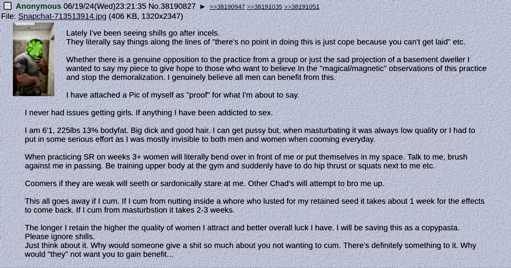 It’s always good to remember why /x/ is the most accurate place for this topic: SR is one of the clearest paranormal inducing topics among all discussed on /x/. It’s a sacred practice that has been the one of the main focuses in every major religion or spiritual practices. The mystical side of it is what we try to focus on.SR can be also be seen as a political issue. The porn industry is a tool made by the Jews to deteriorate and corrupt societies. Porn works in ways that program new sets of behaviour in its audience and because of its strong addictive qualities they stay hooked. The most important goal for porn’s male audience was and is the release of their semen. As we now know, the disadvantageous consequences of releasing are heavy: a man becomes less of a man, he gets sick and weak, his mind numbed, he will have impotence issues etc. Upto the point his spirit almost dies.SR is beneficial to make one healthier and stronger, more fit, if you will. So the topic could be discussed on /fit/. Anyone looking for more ways to get fitness gains would benefit hugely from the SR.Also SR has so many other benefits that it could be discussed in the /adv/ board. These would be topics how it improves one’s social life, mental state, makes more time to be more productive etc.The biggest benefits of SR are mystical in nature and the whole practice is fundamentally very close to the spiritual side of things. All the other topics in /x/ are left far behind and SR actually makes this board of any relevancy. This is also known by the enemy and they make strong efforts to suppress, hijack, twist to end this discussion.SRX-related YouTube videos:https://www.youtube.com/watch?v=oby08eHpIOwhttps://www.youtube.com/watch?v=xroX6M5BMUAhttps://www.youtube.com/watch?v=a1Um1Njhe2Y