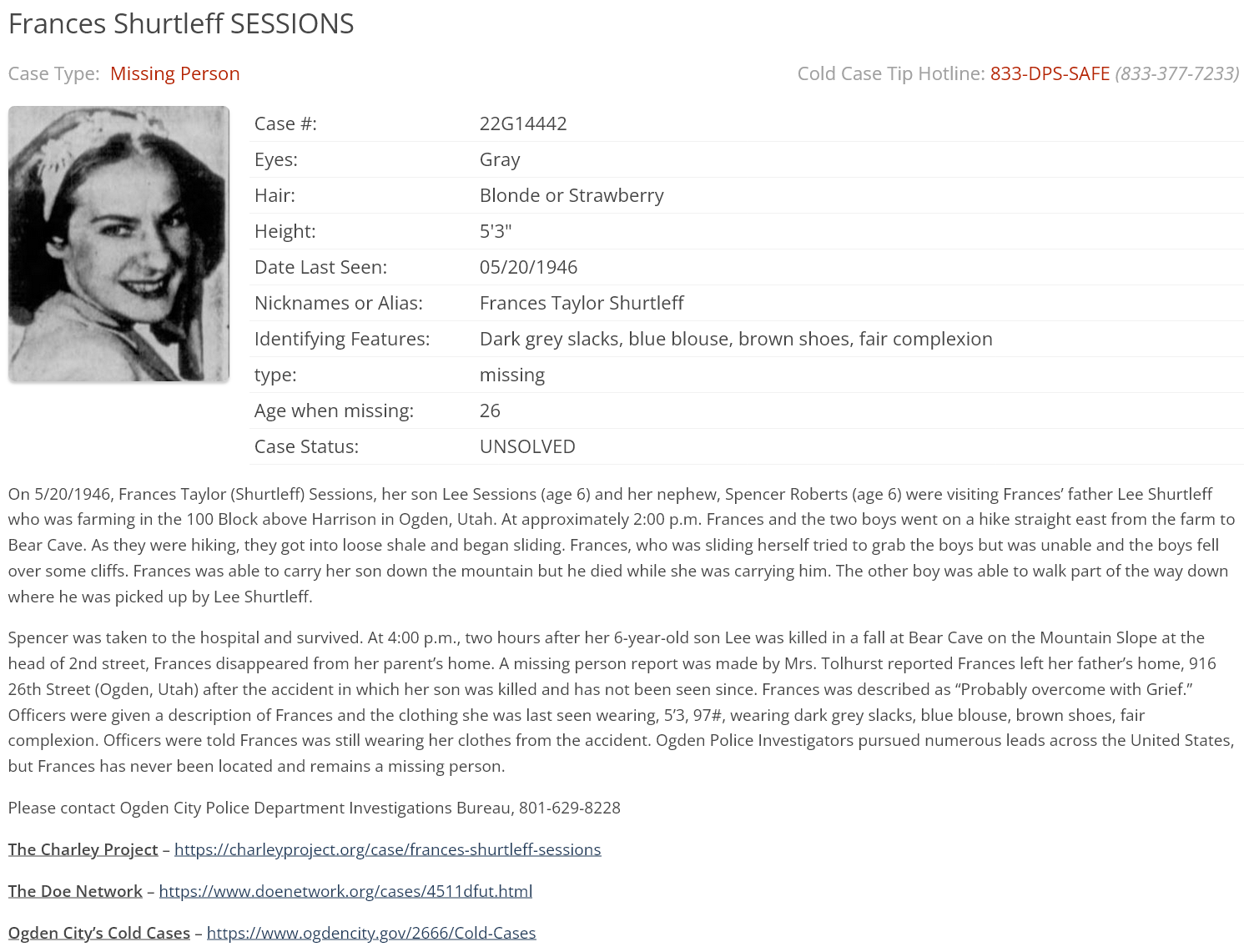 On an icy Friday in January of 1956, six-year old Susan Cadieux was playing with her older brothers and a friend at a playground not far from her home in London, Ontario. At approximately 7:45 PM, a man approached Susan, and claimed that he had something to give her. He then told the other children that he was meeting with a priest at a church, and that he lived on York Street (although he pointed towards King Street). When Susan had not returned by 8 PM, her brothers told their parents, who then contacted police. By 1:30 AM, around 300 people had joined the search. The following morning, at about 10 AM, Susan's body was found in a nearby warehouse. She had been sexually assaulted, and her cause of death was listed as exposure. It is believed she died less than 3 hours before being found.Tears were frozen to her face.Her killer was never apprehended.