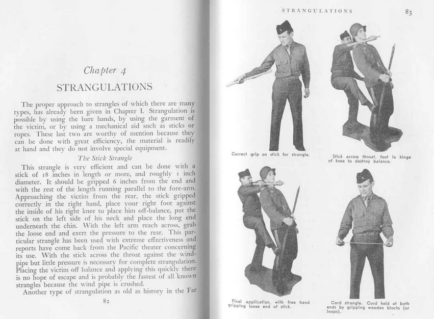 >>41904319I know the difference between blood chokes and air chokes, that's why I directly mentioned them. My garrote technique comes from the 1943 edition of Applegate Rex's Kill or Get Killed. There, the cord strangle is classified as a *strangle*, meaning it cuts of blood supply rather than just air supply. And the garrote or cord strangle is explicitly mentioned as working faster than the common rear-naked-choke which is taught in the same book.https://archive.org/details/Kill_or_Get_Killed_1943_Rex_Applegate/page/n89/mode/2upIf cords do not strangle or blood choke people then why do people who hang themselves pass out in 10 seconds rather than several minutes?https://journals.lww.com/amjforensicmedicine/abstract/2011/06000/agonal_sequences_in_14_filmed_hangings_with.3.aspxWith the cord strangle which is not tight enough to prevent me from breathing I can feel a few symptoms of strangulation: the tinnitus and blood pressure stuff, but I do not develop red dots on my skin, lose bladder control, lose bowel control, or most importantly fall unconscious. With the stick strangle which is an air choke as well as a blood choke I feel the previously mentioned symptoms but I do not feel them when holding my breath for the same length of time. Other sources I used to learn about strangulation:https://www.supremecourt.ohio.gov/docs/JCS/courtSvcs/resources/Non-FatalStrangulationMyths.pdfhttps://www.tandfonline.com/doi/full/10.1080/24748668.2020.1780873