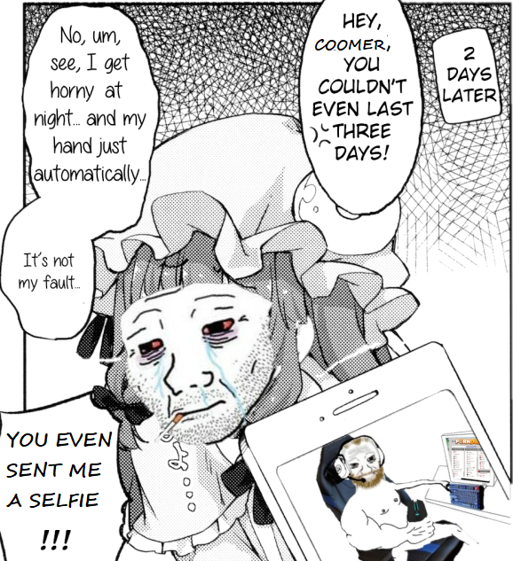 >6 day no fapping>4 days no (intentional) pornMy inner coomer has been throwing a massive tantrum today, begging to have just a small little peek inside the pron folder, it's been unbearable. But like a spoiled child I chose to ignore him, because if I give in, he learns that throwing tantrums and making me feel like shit is how he can get what he wants