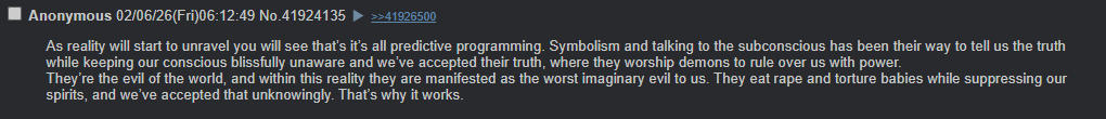 >>41940169Hes right.Elites worship demons and rape kids, steal your hard earned money to perform satanic rituals. Every person you look up to is in this cult and owns 99%+ of the wealth. How can you cope?