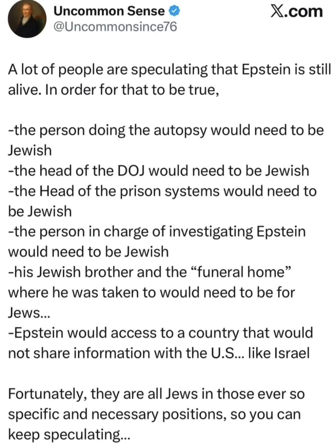 I was on board with "epstein didn't kill himself" thing, as in LITERALLY he did not kill himself and was instead murdered by clintons hitmen or whoever. Made sense to me considering all the compromising dirt he held on important people.But now the movement is overran by tards (like many in this thread) who think he didn't die AT ALL and is instead chilling out in Tel Aviv or some shit with a new face. How did this theory gain traction? Is there literally any evidence to support it? Why would they keep him alive with a fake identity and new face when it's surely just easier to off him?