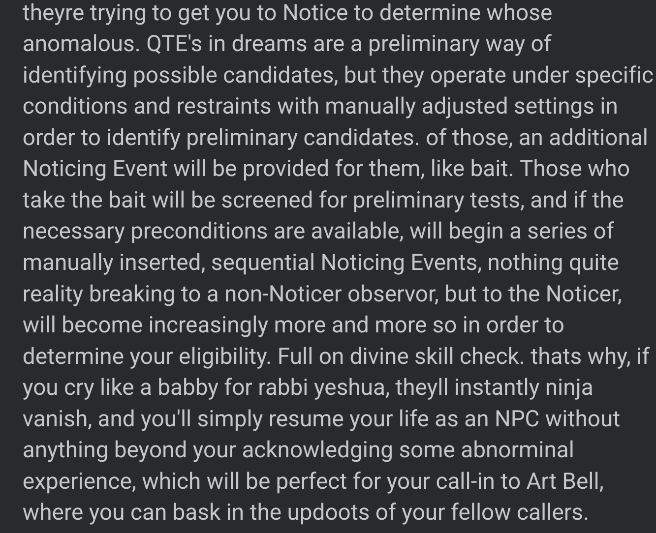 >>41982680>Other point is I think all people get multiple chances of self-initiation in life, as in a chance to step out of their mental prison and leave it behind completely.you are correct. life consists of a series of skill checks, not usually in the material, but in the immaterial. dreams are usually the infrastructure which allows the gods to peak under the hood and make sleight alterations. tweaks to patterns of thought, variables introduced outside of material possibility, QTE events to judge your reaction to certain scenarios.once someone becomes a potential candidate for ascension they will screened in the material. it begins with an experience some sort of Noticing event, which will involve a series of escalating increasingly noticable syncronicities that exist right at the boundary of possibility, and statistically, will be impossible, in an effort to get you to "Notice" [the gods], and the lack of privacy in your own consciousness.from here there are several possible outcomes, the person returns to their programming, the person attempts to play god with the gods, or the person casts aside environmentally imposed precaution to witness and observe, learn and ultimately, remember.