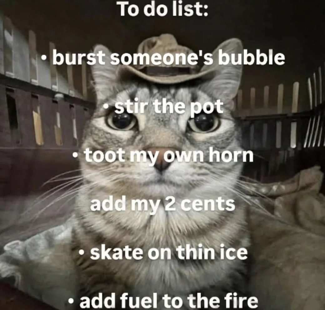 >>41982098what does being a crazy narcissist weirdo showing the world what a hypocrite can do if other hypocrites unite in an hypocrites group of folks who say one thing but do anotherweaker then any other faiththat does not share their ownbut able to over power the others by shear numbersbut only ifall the other faithsrefust to put their past difference beside themand deal with a common enemylong enoughto go back to fighing amonst themselves againjustya knowin ways that are saneand notthreating to killeveryone out of spitejust causesome "feelings"got hurtin waysliars told themselvescould never happenas long as their "one true god"was the real dealand it was everyone else's version that was fakeinstead of theirsonly to be wrongand it was their god who was fake after alland all the "real" godsexistingif I say they do or notI mean duha god can't be realif it needs my perpission to existthat's just like basic level shiteven little kidscan figure out on their ownduh...https://www.youtube.com/watch?v=wbjc55JqkGs*awkward*