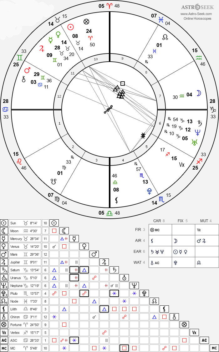 >>41989963Data used (and what you must provide for me for my system to work correctly):Planet positions:Sun in Taurus 8°14’, in 10th HouseMoon in Aquarius 4°30’, in 7th HouseMercury in Taurus 28°34’, in 11th HouseVenus in Taurus 14°20’, in 11th HouseMars in Gemini 29°36’, in 12th HouseJupiter in Gemini 9°01’, in 11th HouseSaturn in Capricorn 13°54’, Retrograde, in 6th HouseUranus in Capricorn 5°10’, Retrograde, in 6th HouseNeptune in Capricorn 12°19’, Retrograde, in 6th HousePluto in Scorpio 13°57’, Retrograde, in 4th HouseNorth Node in Pisces 1°33’, Retrograde, in 8th HouseLilith in Libra 8°46’, in 4th HouseChiron in Cancer 3°11’, in 12th HouseFortune in Aries 24°50’, in 10th HouseVertex in Sagittarius 15°17’, in 5th HouseASC in Cancer 28°33’MC in Aries 5°48’House Positions (actually, it is Placidus House system):1st House in Cancer 28°33’2nd House in Leo 15°46’3rd House in Virgo 7°04’4th House in Libra 5°48’5th House in Scorpio 14°15’6th House in Sagittarius 25°33’7th House in Capricorn 28°33’8th House in Aquarius 15°46’9th House in Pisces 7°04’10th House in Aries 5°48’11th House in Taurus 14°15’12th House in Gemini 25°33’Planet Aspects:Sun Square Moon (Orb: 3°43’, Applying)Sun Conjunction Venus (Orb: 6°06’, Separating)Sun Trine Saturn (Orb: 5°39’, Applying)Sun Trine Uranus (Orb: 3°03’, Separating)Sun Trine Neptune (Orb: 4°05’, Applying)Sun Opposition Pluto (Orb: 5°43’, Applying)Moon Trine Mercury (Orb: 5°55’, Separating)Moon Square Venus (Orb: 9°50’, Applying)Moon Trine Jupiter (Orb: 4°30’, Applying)Moon Square Pluto (Orb: 9°26’, Applying)(Section continues due to char limit)