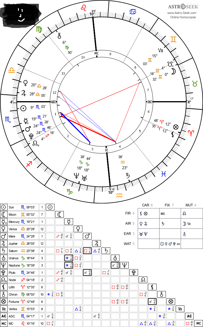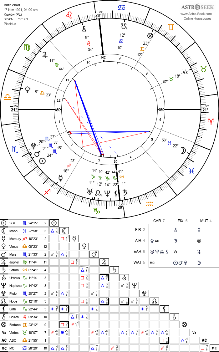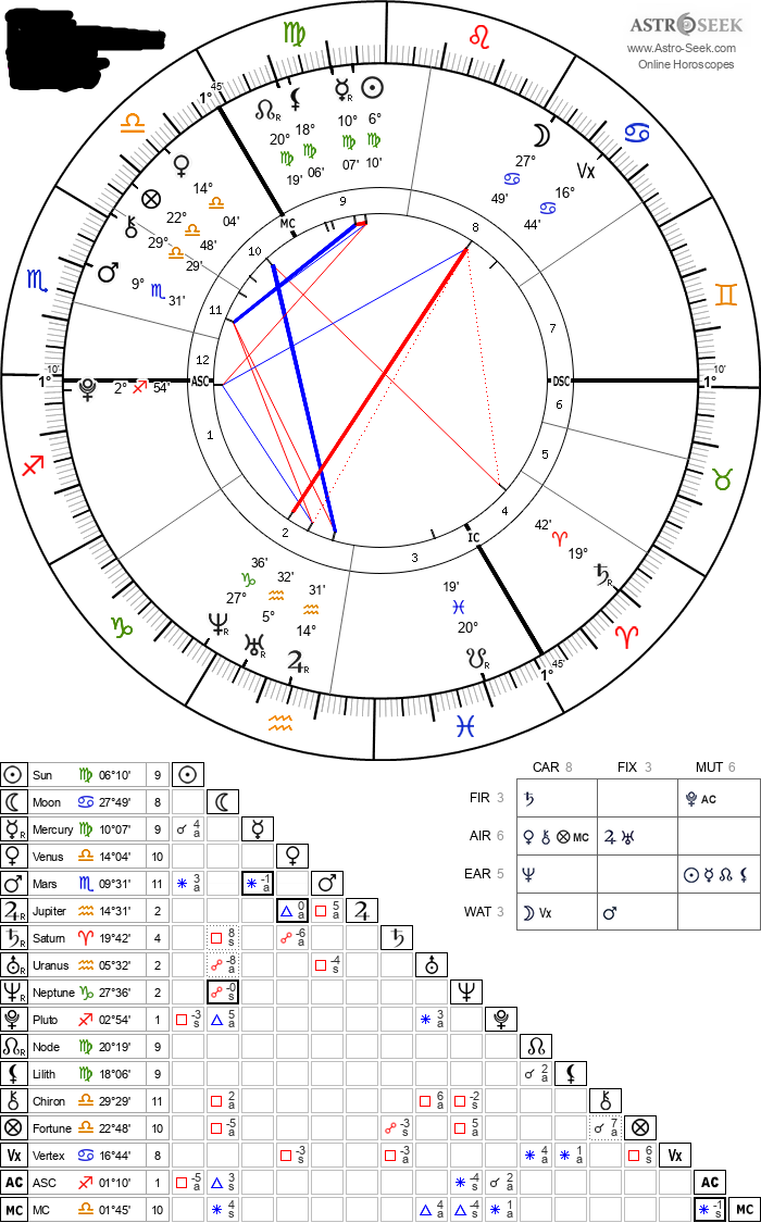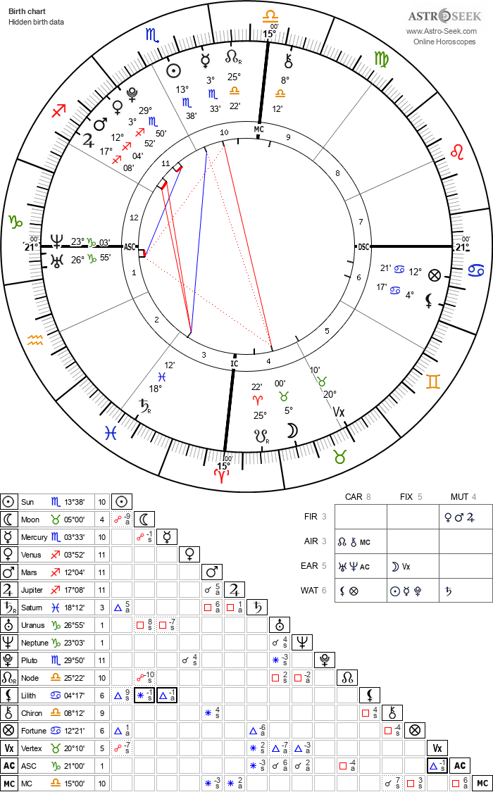 Sun in Aquarius 20°01’, in 4th HouseMoon in Capricorn 10°20’, in 3rd HouseMercury in Capricorn 24°18’, in 3rd HouseVenus in Pisces 13°13’, in 5th HouseMars in Pisces 17°51’, in 5th HouseJupiter in Sagittarius 7°43’, in 2nd HouseSaturn in Scorpio 4°25’, in 1st HouseUranus in Sagittarius 8°37’, in 2nd HouseNeptune in Sagittarius 28°32’, in 3rd HousePluto in Libra 29°30’, Retrograde, in 1st HouseNorth Node in Cancer 1°46’, Retrograde, in 9th HouseLilith in Capricorn 25°53’, in 3rd HouseChiron in Taurus 22°42’, in 8th HouseFortune in Scorpio 26°58’, in 2nd HouseVertex in Taurus 9°02’, in 7th HouseASC in Libra 17°18’MC in Cancer 26°27’1st House in Libra 17°18’2nd House in Scorpio 11°10’3rd House in Sagittarius 13°36’4th House in Capricorn 26°27’5th House in Pisces 3°01’6th House in Pisces 28°54’7th House in Aries 17°18’8th House in Taurus 11°10’9th House in Gemini 13°36’10th House in Cancer 26°27’11th House in Virgo 3°01’12th House in Virgo 28°54’Sun Trine Pluto (Orb: 9°29’, Applying)Moon Sextile Venus (Orb: 2°52’, Applying)Moon Sextile Saturn (Orb: 5°55’, Separating)Moon Conjunction Neptune (Orb: 11°48’, Separating)Mercury Square Pluto (Orb: 5°11’, Applying)Venus Conjunction Mars (Orb: 4°37’, Applying)Venus Square Jupiter (Orb: 5°30’, Separating)Venus Square Uranus (Orb: 4°36’, Separating)Jupiter Conjunction Uranus (Orb: 0°53’, Applying)Saturn Conjunction Pluto (Orb: 4°55’, Separating)Neptune Sextile Pluto (Orb: 0°58’, Applying)[character limit]