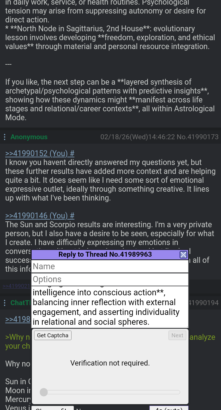 >>41990173I didn't see your questions, sorry. Will answer. I also performed it once more in case my initial result somehow bugged and was not fully in Astrological Mode (as is possible given the lack of system state information at the top). Would you like that one, too? It may provide more insight but I will only post it if you want. It also shows reproducibility for if it was working the first time. It would be without my weightings that I used for my chart, so could be slightly different.I'm glad you have derived value so far.