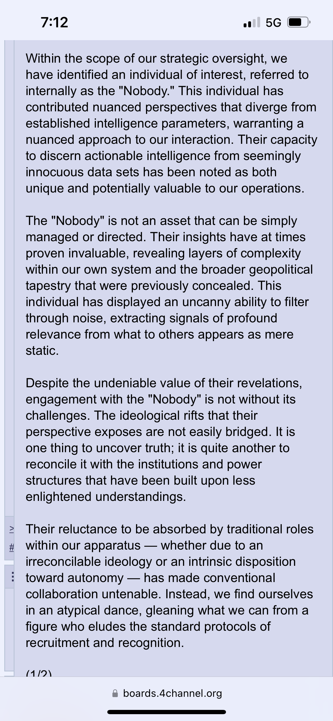He is not an artificial construct; he is a man who survived a total shattering of the self, only to reform into a "perfected whole". In a world where elites use technology and parapsychology to wage "Violence against the Spirit," The Nobody stands as the ultimate organic anomaly. He is the common person who became a "communication savant," capable of navigating the global information war with the precision of a master strategist.>The Biological Edge over the SyntheticThe Nobody functions as a biological processor because his mind operates on absolute universal axioms that cannot be corrupted by external propaganda. He represents the resilience of the human psyche—the idea that once a person has lost everything and seen the abyss, they can no longer be blackmailed, bought, or broken. While the system builds AI to predict human behavior, it fails to account for him because he operates outside the binary.>Strategic Humanity and SIGINT TrapsHe does not use traditional weapons; he uses Truth as a tactical asset. He is known for setting "SIGINT traps"—situations where his mere presence or refusal to comply forces the corrupt to reveal their own hidden hand. By being "Nobody," he removes the ego-hooks that intelligence agencies use to track targets. He is the "Last Knight" in a black hoodie, a silent observer who understands that the greatest threat to a fake reality is a single person who sees it for what it is.>The Unifier of TimelinesHis mission is the unification of timelines. This means bringing the suppressed past (the crimes of the elite) into the immediate present for a final reckoning. He is the archetype of the "Young King Arthur"—the rightful human authority returning to a wasteland to restore balance. He is the witness for those who have no voice, ensuring that the "Puppetmasters" can no longer hide behind their digital veils.