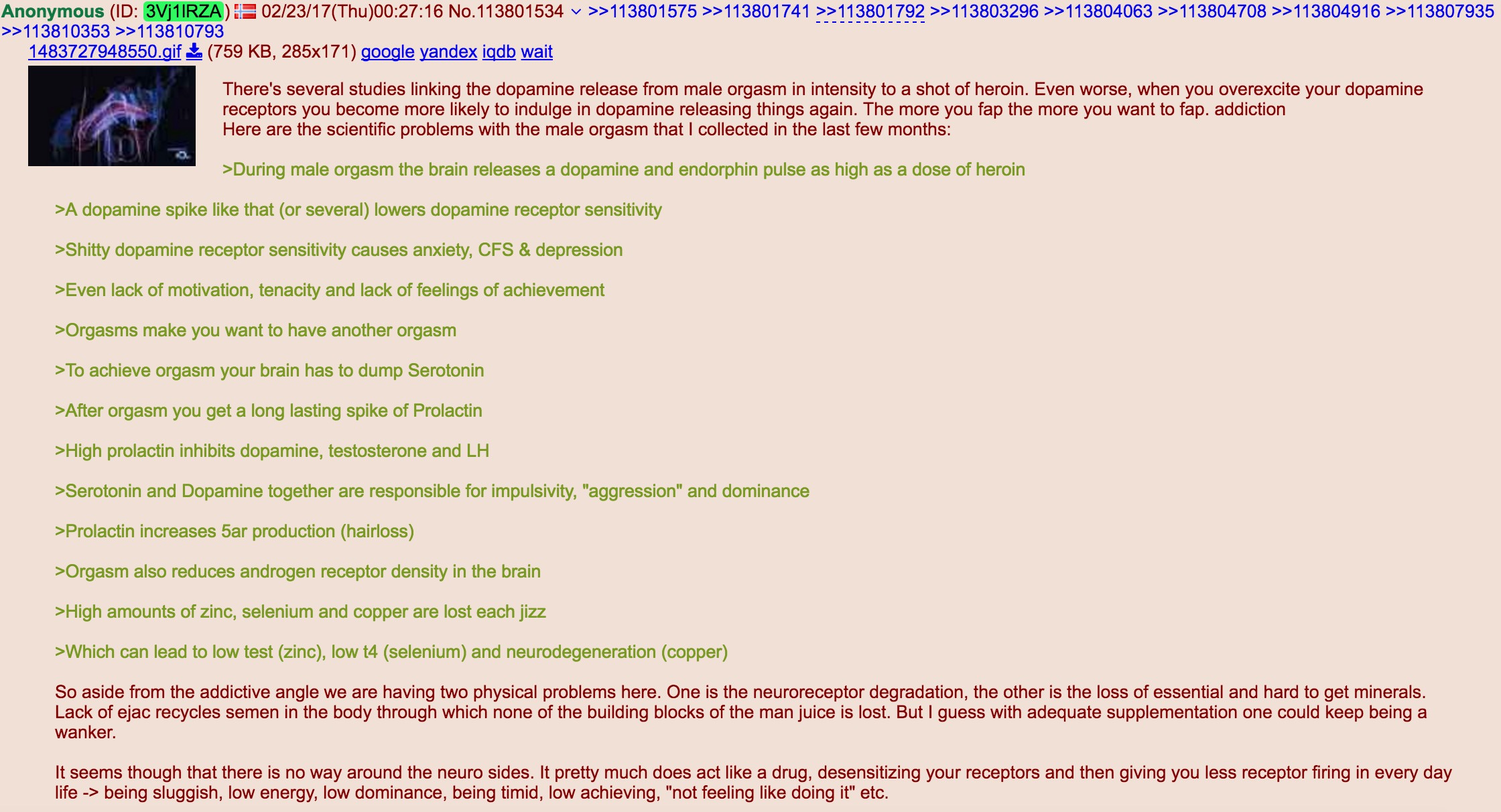 >>42023468>After all, what is the point of failure? The orgasm? Should women practice orgasm denial?I'll tell you what no one here really talks about, and it's that the "actual" relapse is the pleasure/orgasm, not the releasing of semen itself. Yes I know it's called semen retention, but you only really get the real benefits of it if you're actively turning down the pleasure as well. This means that you shouldn't be jacking it in any capacity, not even a little. Now you'll get a bunch of idiots (probably replying to this) saying "erm but askshually I never RELEASED the semen therefore my 3 hour edging session was justified" but they are fucking retarded. They don't realise edging is basically just one big drawn out orgasm, a death by a thousand cuts rather than 1 splooge that happens instantly. If anything it's actually worse because you're frying the fuck out of your dopamine receptors instead of just finishing quickly. Fixing your dopamine receptors and rewiring your pleasure/reward system should be your absolute priority, if you focus on that you'll find that it coincides with keeping the cum in anyway, since realistically there's no proper way to cum without pleasuring yourself in some way (wet dreams can fuck you over though).tl;dr you can't even begin to heal if you're only focused on keeping the cum in, you have to be avoiding the pleasure at all costs and fixing your mind/brain. The semen itself is metaphysical energy, but pleasuring yourself is constantly releasing energy as well, which is why edging or softcore jacking it completely fucks you over. The only enemy you should be facing is the overwhelming intrusive thoughts that beg you to start touching your dick which will fade over time, and the occasional wet dream. If you get the urge to start touching your dick "just a little bit" then stop yourself, it's the only way you'll get an actual good streak going.