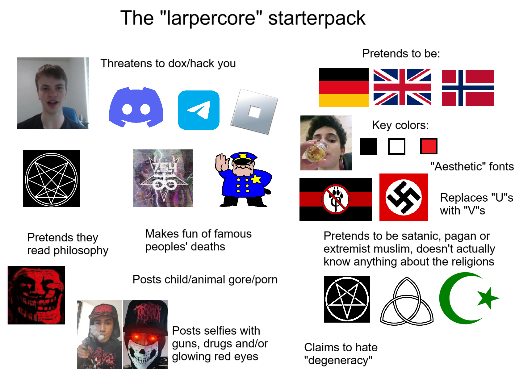 >>42025767The innoucous stuff is vampire larpers like for roleplaying games and just some edgy teenagers. the darker stuff is a lot harder to describe, I don't really know what you could even call it, just very strange groups of very spurious people.I guess I'd just call it a darkweb rabbithole and leave it at that. I know that makes it sound all cool but its all very cringe and depressing. Maybe its what happens when edgy teenagers start to do very illegal shit like ONA/764/larpercore/"comms" but for people who've played vampire: the masquerade? no idea really I'm just spitballing.